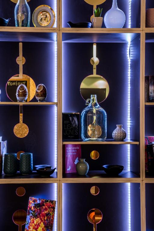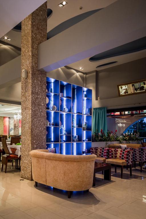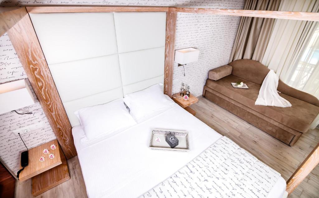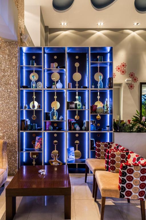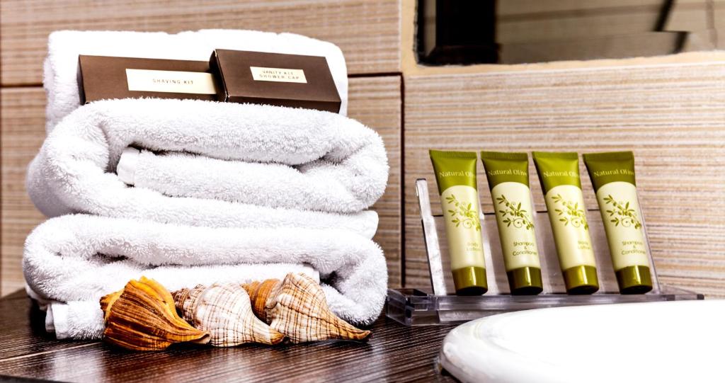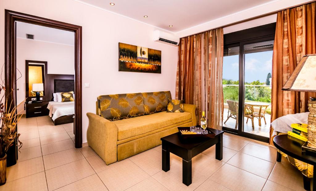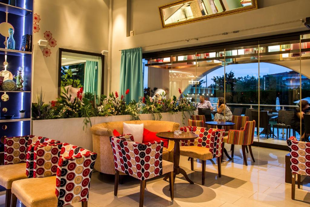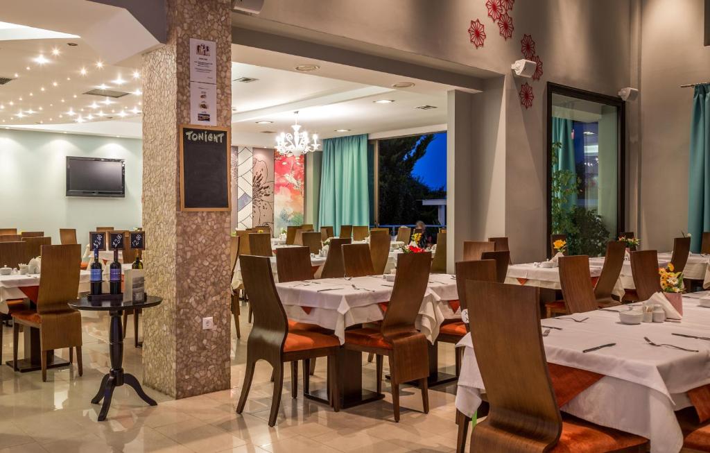 Camerele luminoase sunt dotate cu aer condiționat, TV, mini-frigider și balcon - majoritatea cu vedere spre mare sau grădină. Oaspeții se pot bucura de micul dejun servit in zona de dining cu terasă, cu vedere panoramică spre Marea Egee.