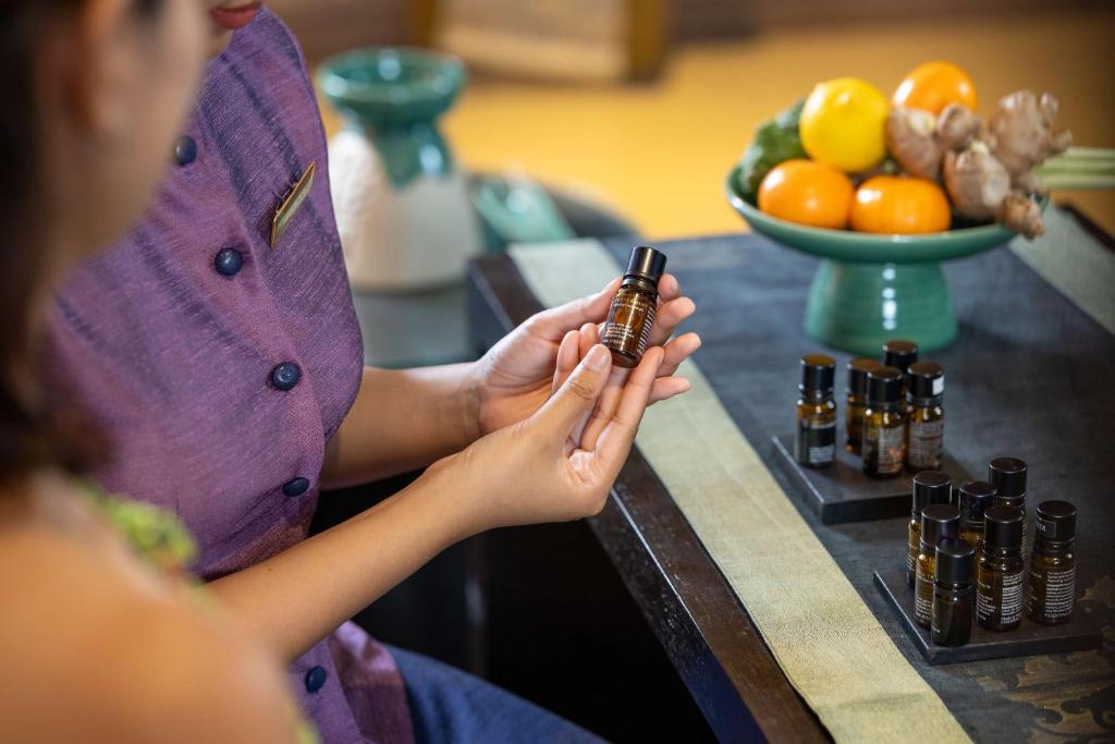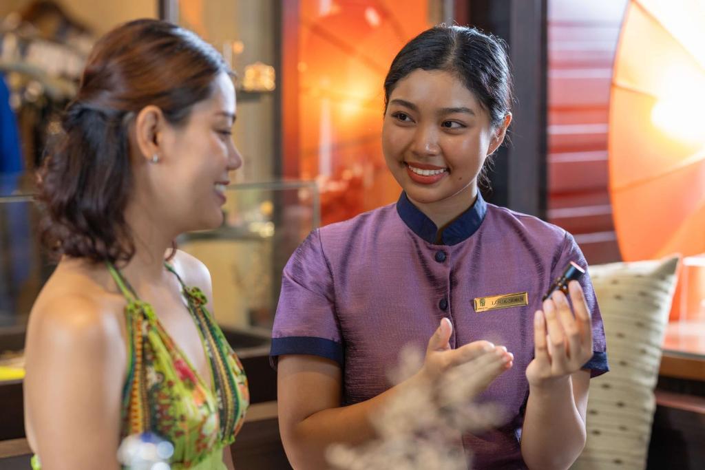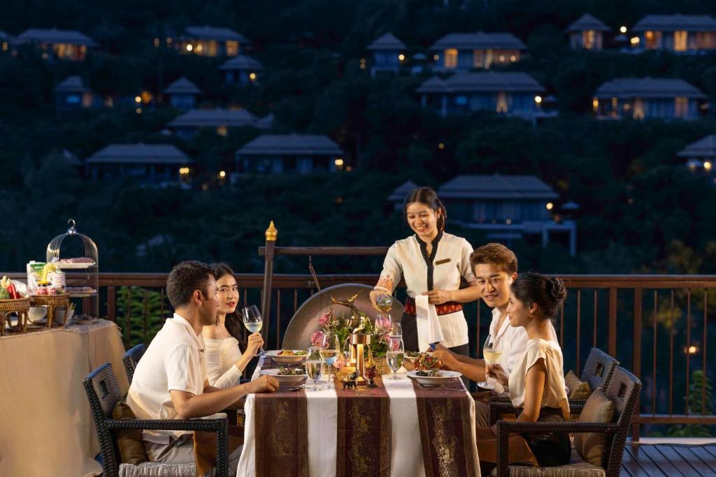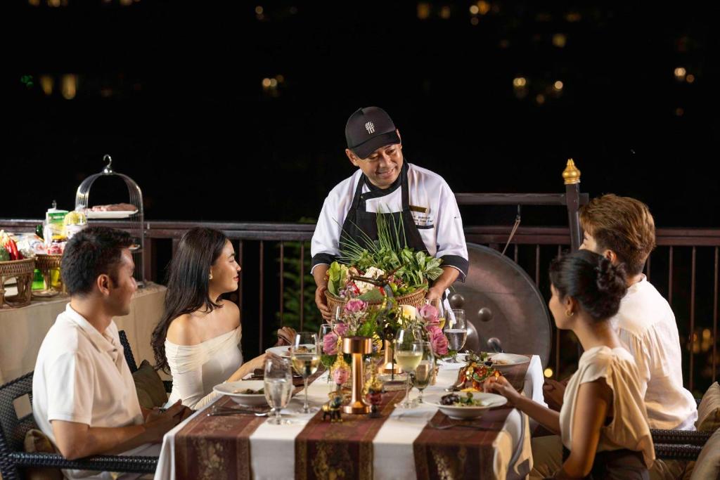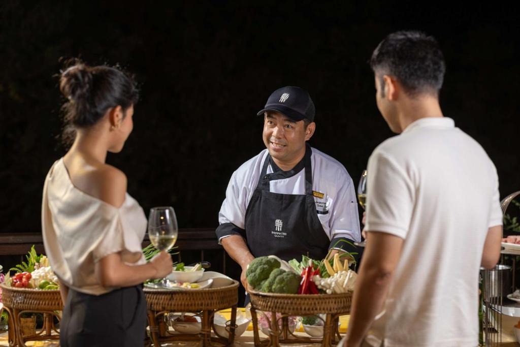The Edge serveste un mic dejun tip bufet, care include o serie de preparate internationale. Restaurantul Saffron oferă mancăruri autentice thailandeze. Printre alte optiuni de luat masa se numără lounge-ul din hol, barul de la piscină si Sands, rotiseria de pe plajă a complexului Banyan Tree.