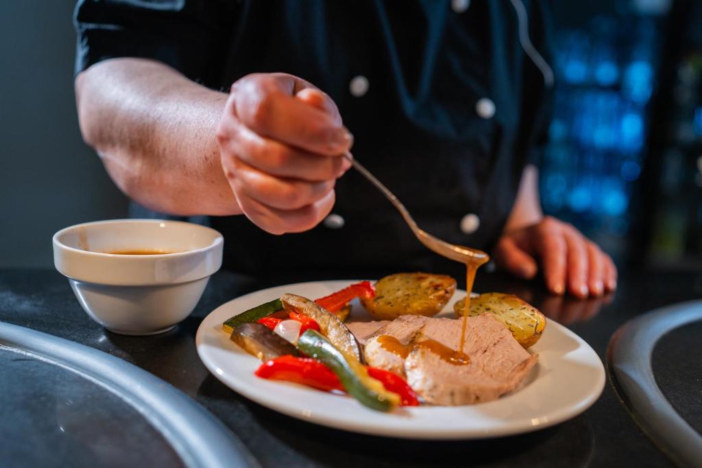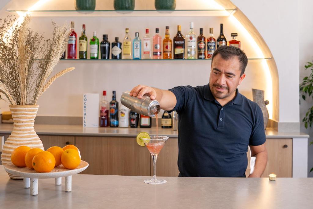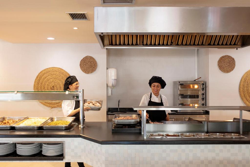 Restaurantul tip bufet servește preparate locale și internaționale, in timp ce barul de la piscină oferă gustări și inghețată.