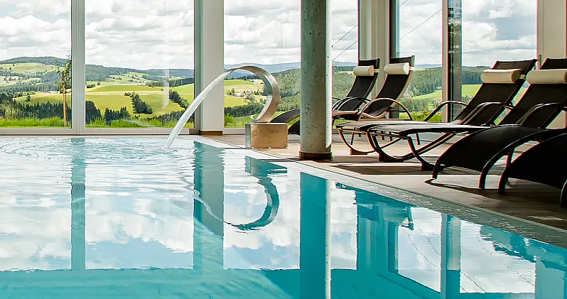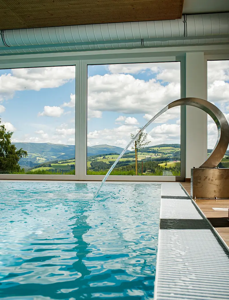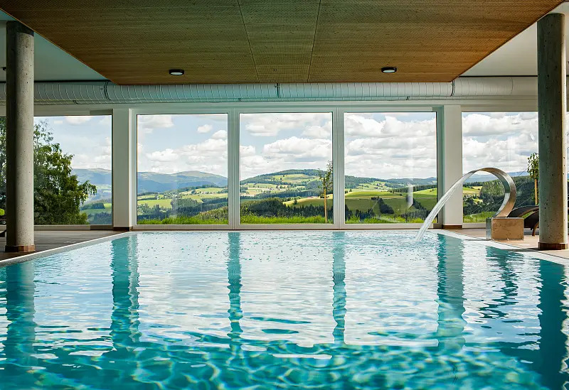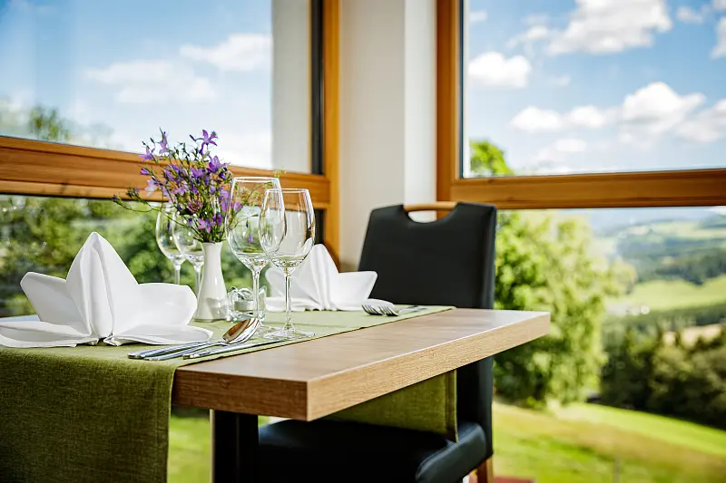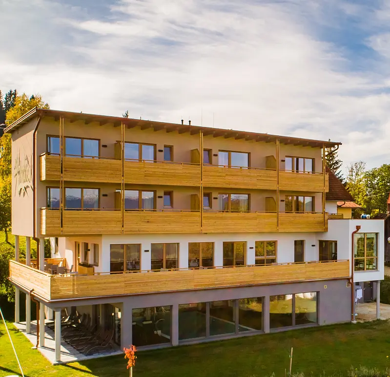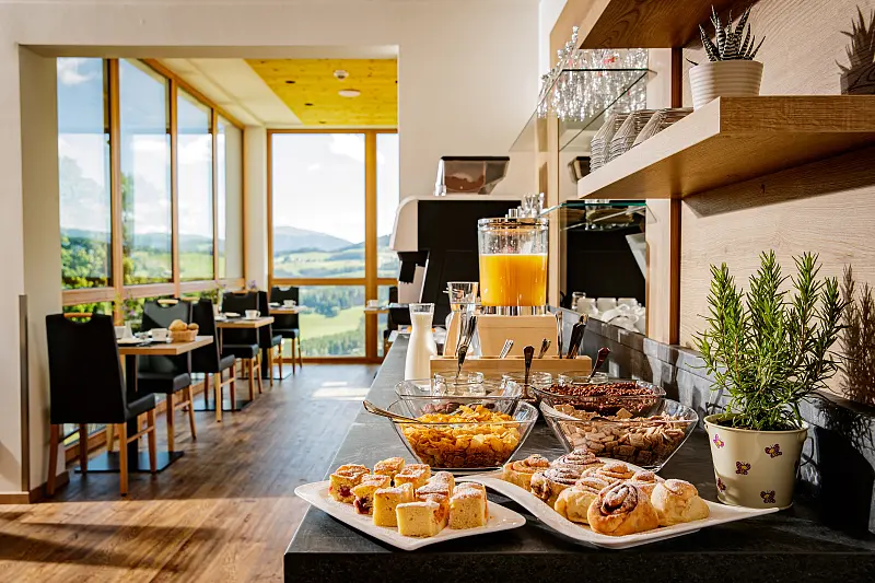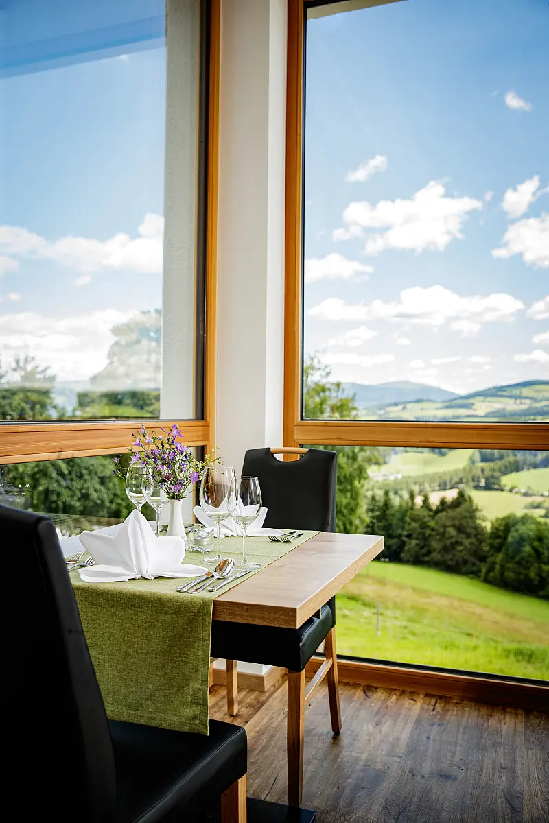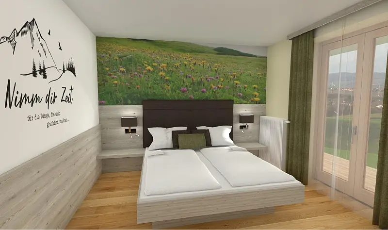 The Almblick Experiences at 1000 m above sea level with a wonderful panoramic VIEW of the surrounding forests and mountains! Relaxation, holiday quality and relaxing MOMENTS await you. Enjoy real Styrian hospitality, cosiness, traditional cuisine with local products and the untouched nature of the surrounding Joglland. Our highlights: 8 Almblick deluxe rooms for wonderful nights 7 newly renovated nature view and panoramic view rooms Panorama SPA with indoor infinity pool with 180° view Panorama restaurant & winter garden for moments of pleasure Alm panorama terrace with a wonderful VIEW Dogs are not allowed in the AlmBLICK category. facility / Ambiance: comfortable, family friendly, modern, small / homey, suitable for wheelchairs, home-made target audience: sport & active travellers, couples, motorcycle travellers, nature lovers, senior citizens, shorttrip travellers, wellness travellers, mountainbiker / bicycle travellers, families, singles with kids