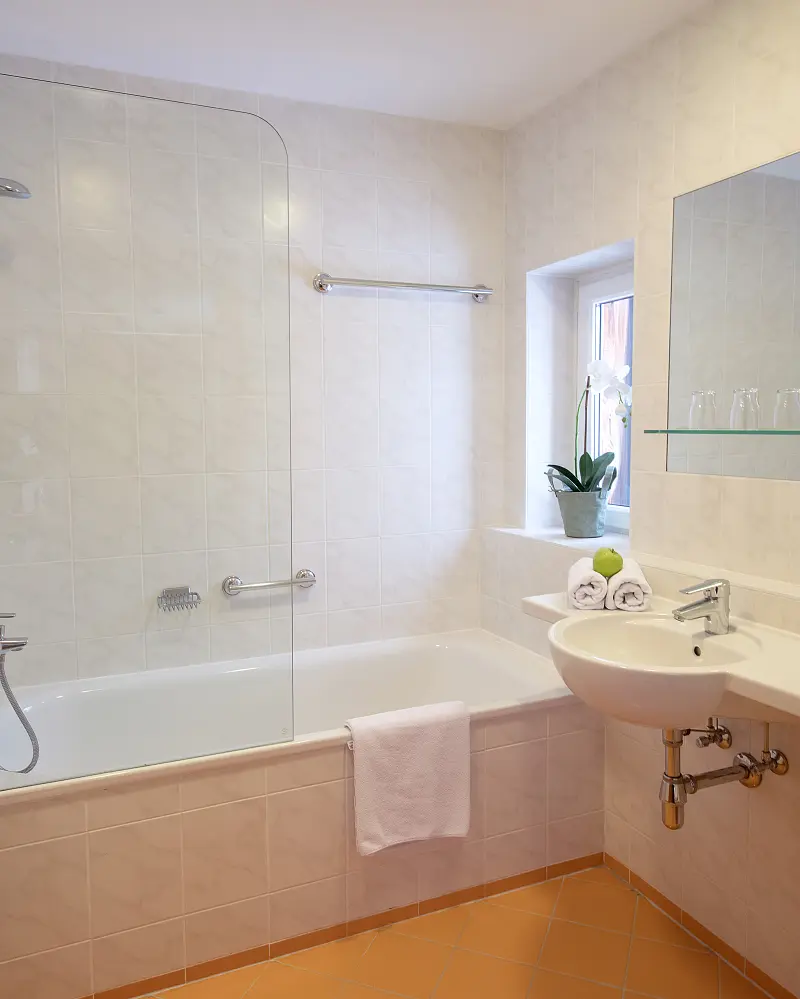 bath room: bath tub / shower, toilet, separat toilet, hair dryer, bath tub, bath robe - on request