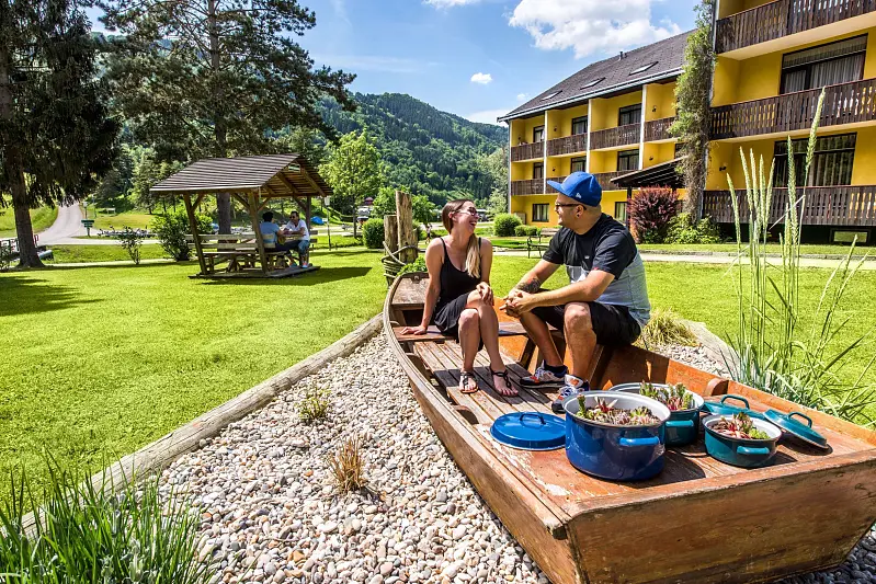 The Riverresort is located directly at the natural wonder of the Danube loop in Schlögen. Exciting possibilities for excursions, the ship pier directly in front of the hotel, numerous hiking, cycling and mountain biking routes as well as an extraordinary nature experience invite you to discover. Whether a wellness weekend with your partner, a family, hiking or cycling holiday or a stay just to relax and unwind - the Riverresort offers countless possibilities. The wellness paradise with indoor pool, various saunas, a quiet island and a sun terrace as well as the relaxation area with hammocks on the Danube invite you to relax after an eventful day.