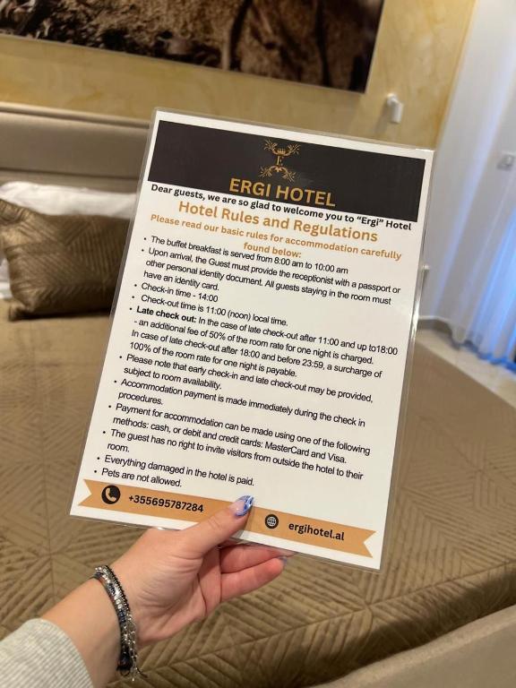 Hotel Ergi se află in Durrës, la 41 km de Piața Skanderbeg și la 45 km de Telecabina Dajti Ekspres. Acest hotel de 3 stele oferă bar, precum și camere cu aer și WiFi gratuit, care beneficiază toate de o baie proprie. Acest hotel se află la 17 minute de mers pe jos de Shkëmbi i Kavajës și la 41 km de Former Residence of Enver Hoxha.