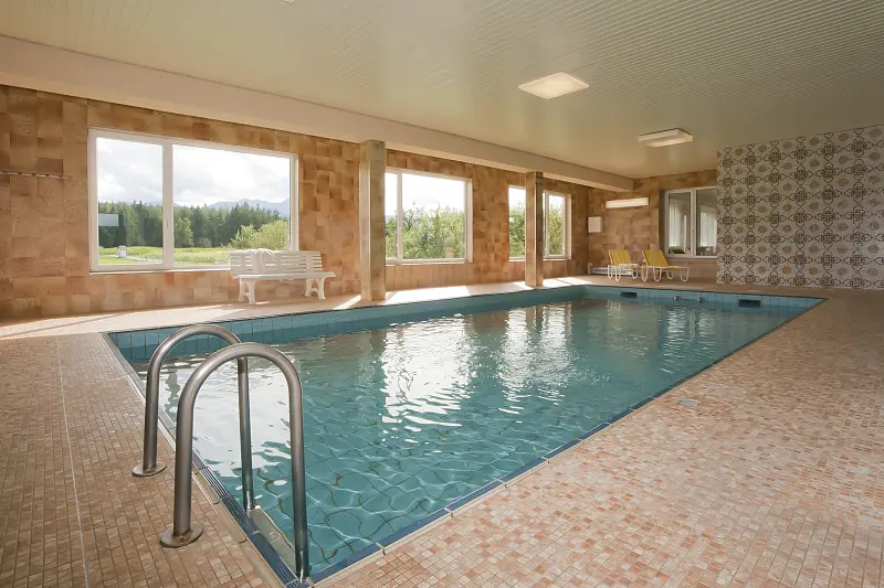 outdoor swimming pool 100 m², indoor swimming pool 45 m², steam bath - free of charge, sauna - free of charge, finish sauna - free of charge, garden, lawn, deck chair - free of charge