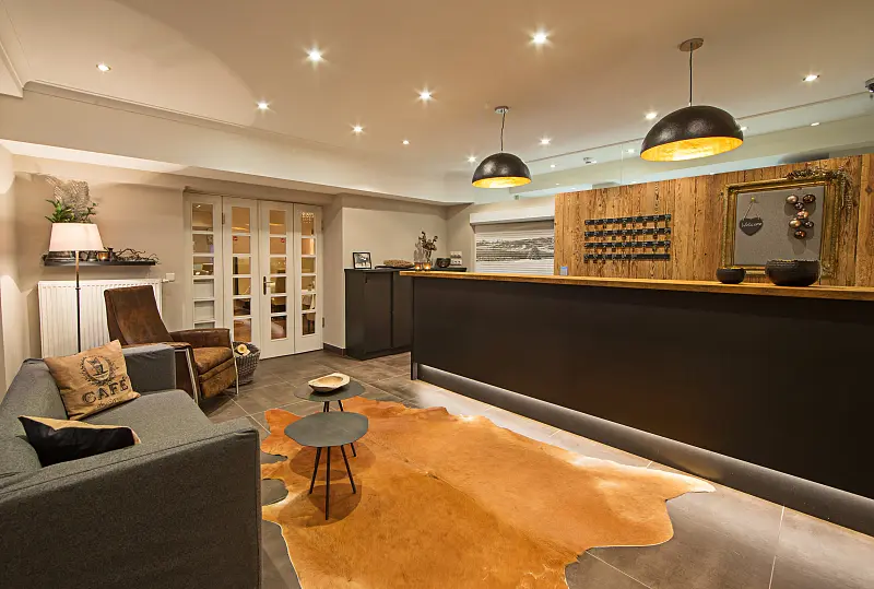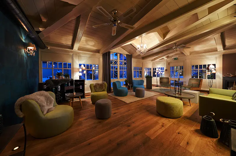 Exclusive, luxurious and cozy hotel with a special flair. Newly remodeled and redesigned with panoramic terrace above the rooftops of Zell am See. Relounge of winter garden, bar and entrance area.