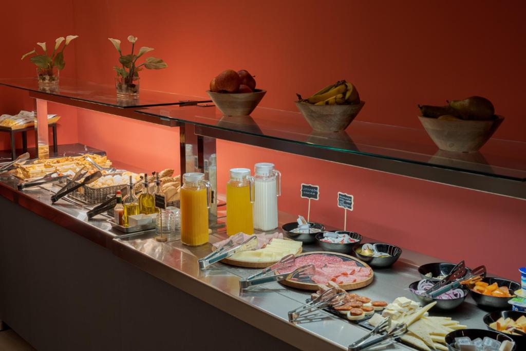 Mic dejun delicios: Un mic dejun tip bufet este servit cu suc, branză și fructe.