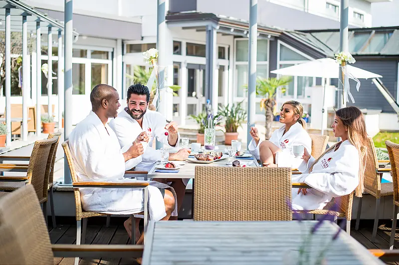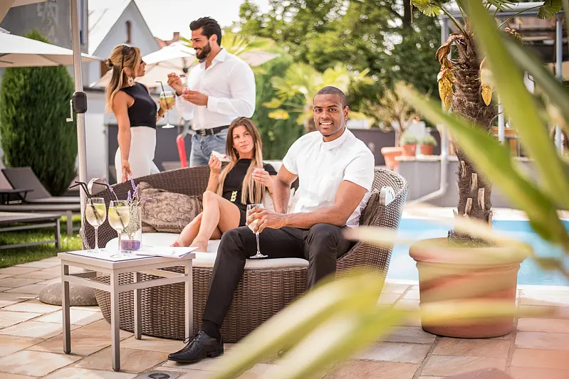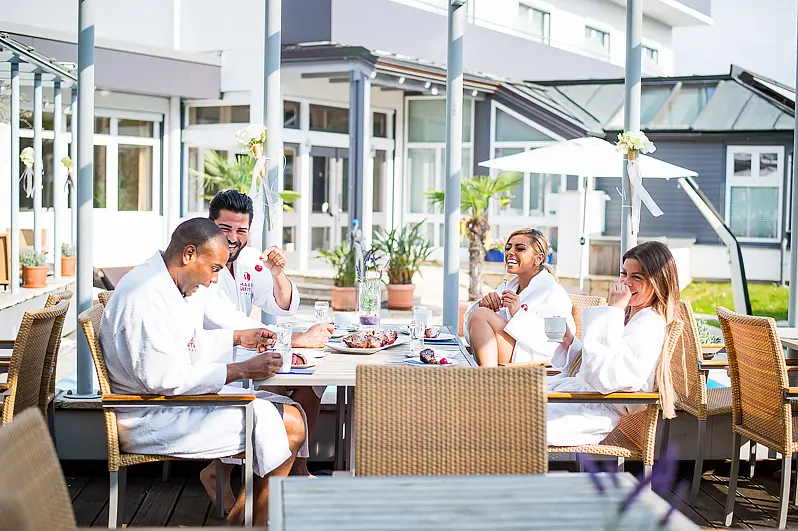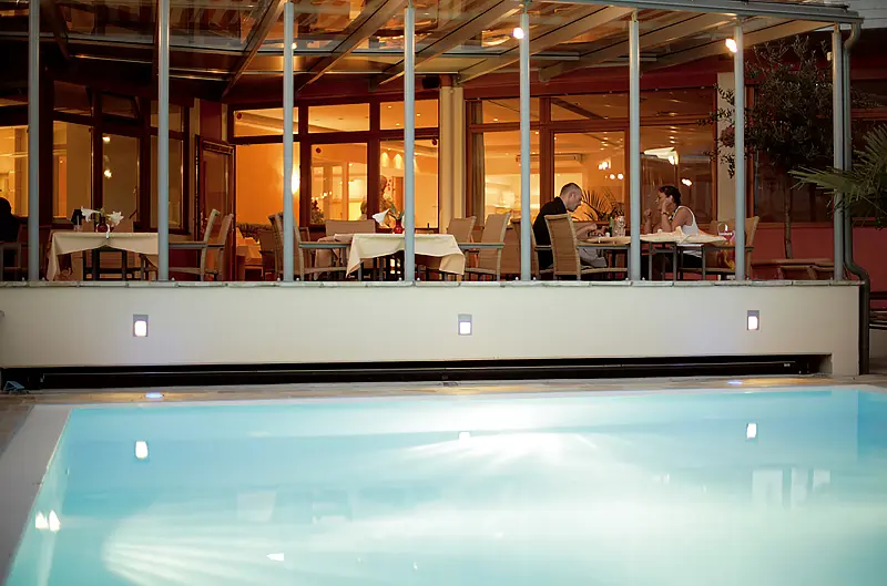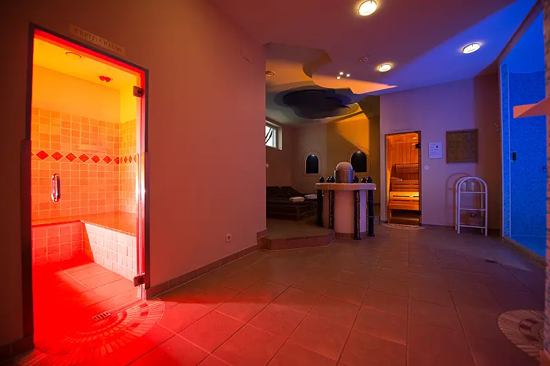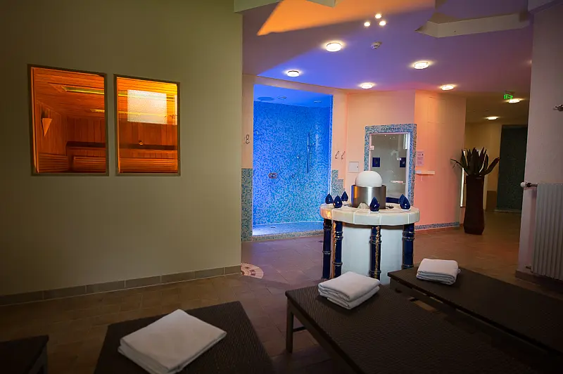 size wellness area 300 m², outdoor swimming pool 6 m x 6 m, indoor swimming pool 50 m², steam bath - free of charge, sauna - free of charge, tepidarium - free of charge, relax room, garden, lawn, deck chair - free of charge, sun umbrellas - free of charge