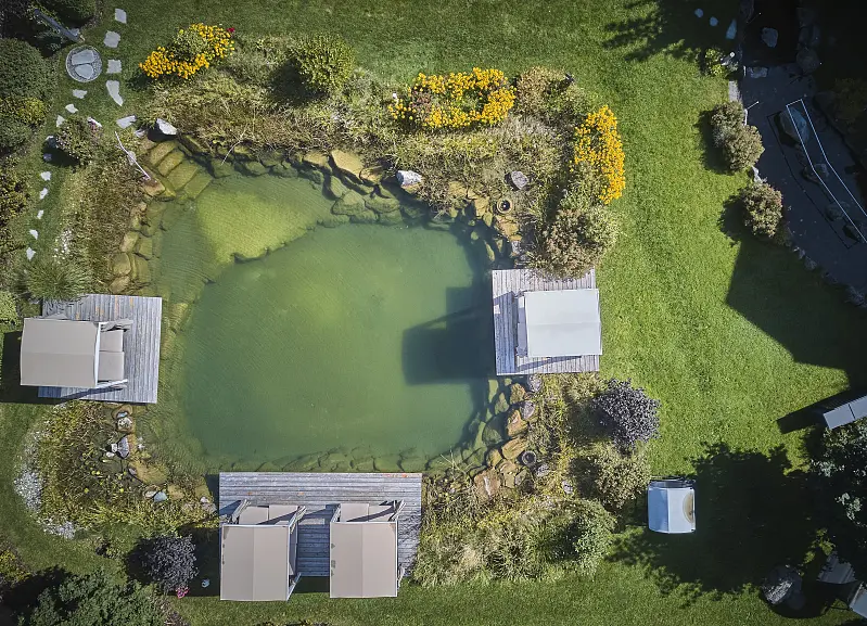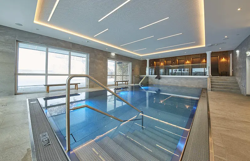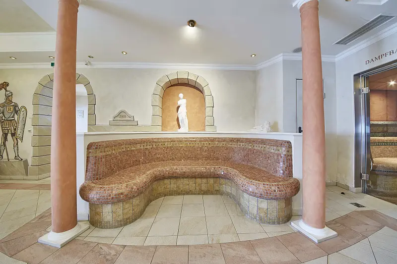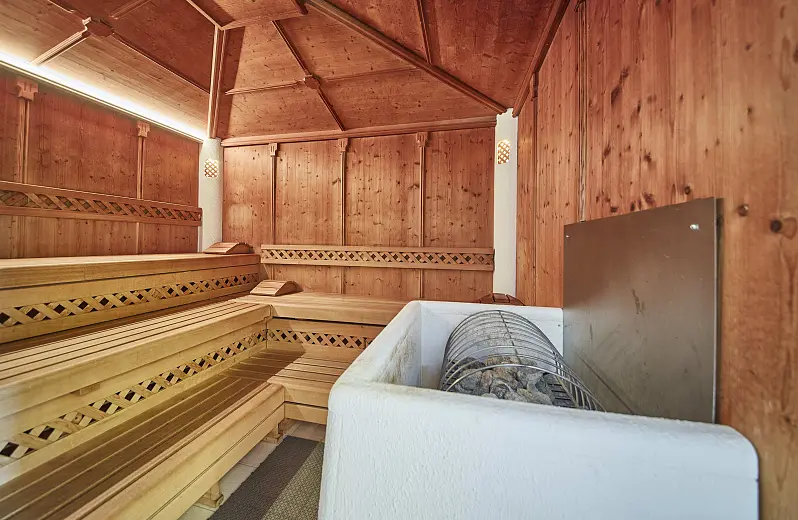 size wellness area 300 m², swimming pool area, outdoor swimming pool 12 m x 5 m, indoor swimming pool 10 m x 5 m, natural bathing area, spa area: children of 14 years. only in the company of an adult - free of charge, steam bath - free of charge, sauna - free of charge, finish sauna - free of charge, textile sauna, infrared cabin - free of charge, kneipp basin, relax room, nudity area, massage - on request, optional payable in resort, solarium - optional payable in resort, garden, lawn, deck chair - free of charge, sun umbrellas - free of charge