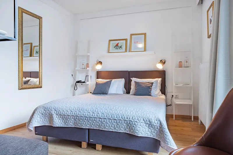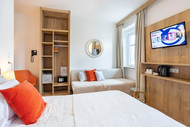 number of beds: double bed 1x, sofa bed for 1 person 1x, cot as overcrowding possible: No