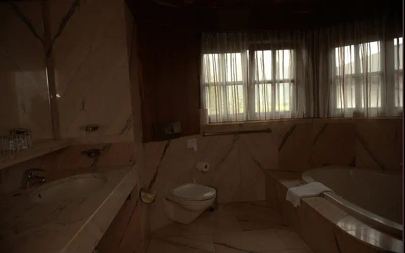 bath room: bath tub / shower, toilet, hair dryer