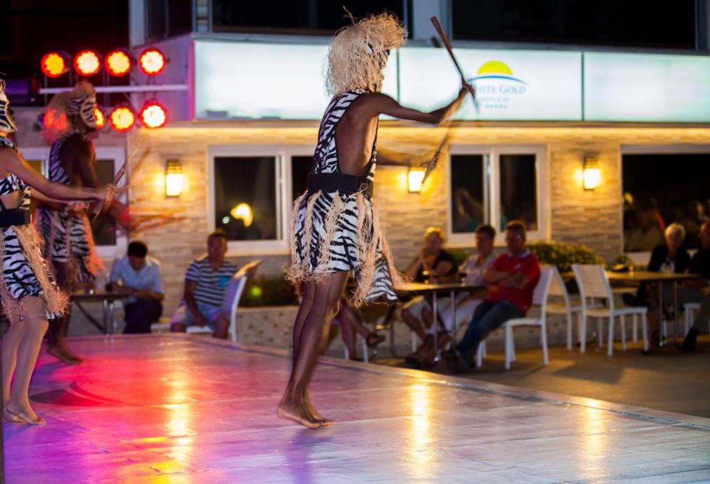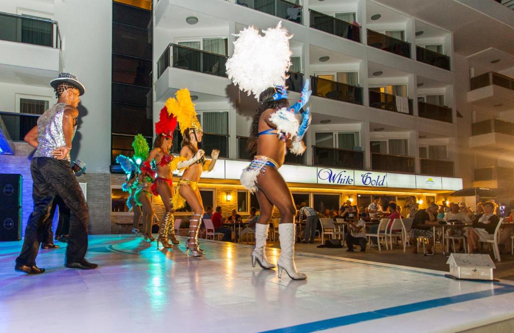Micul dejun, pranzul și cina sunt servite in stil bufet la Hotelul White Gold. Puteți gusta mancăruri tradiționale și internaționale la restaurant. Barul servește băuturi răcoritoare. Puteți beneficia de umbrele de soare și șezlonguri gratuite atat in zona piscinei, cat și pe plajă. Facilitățile spa includ o baie turcească, saună și sală de fitness.