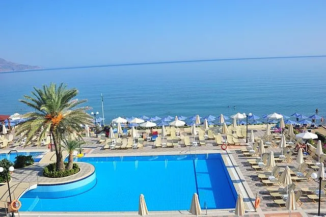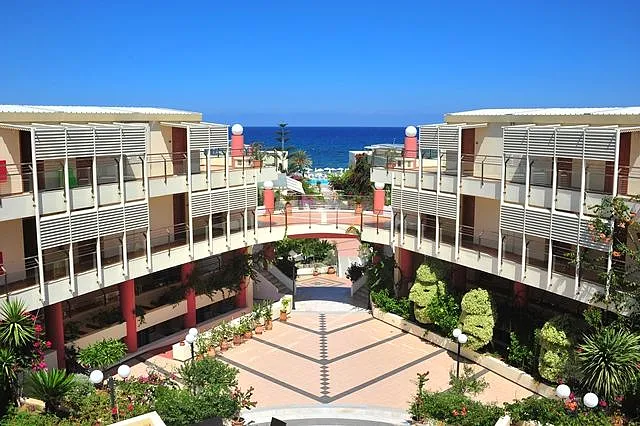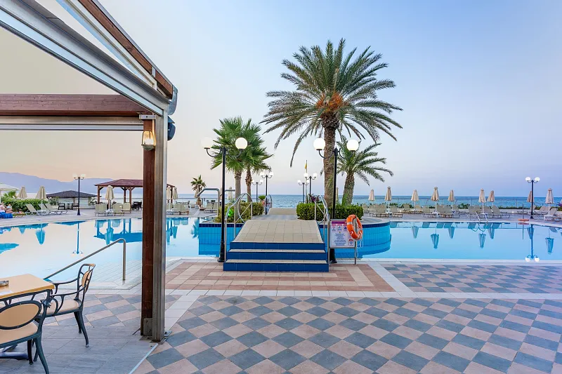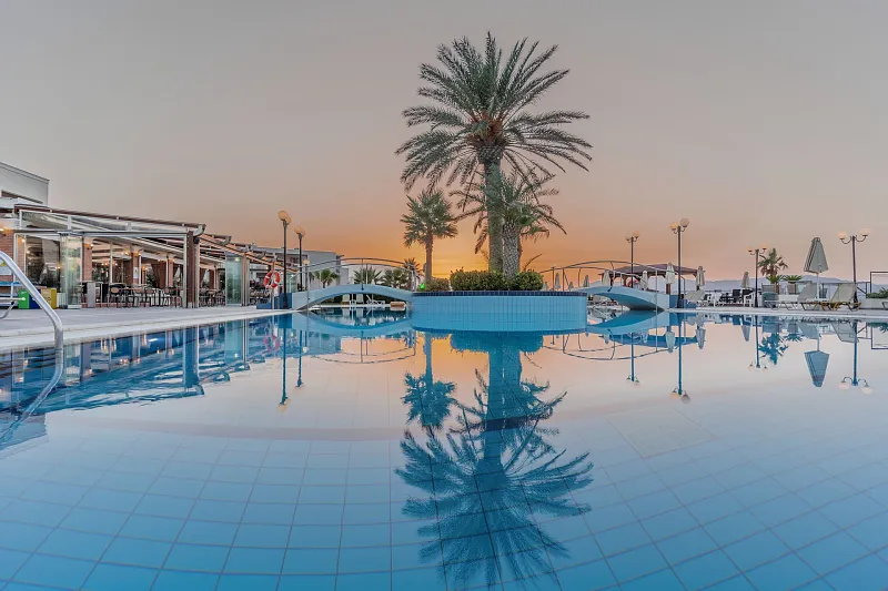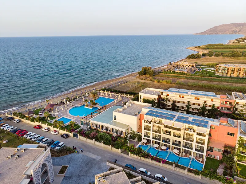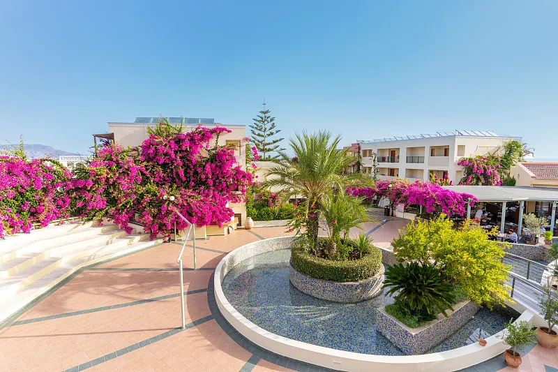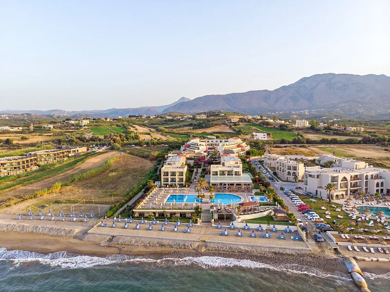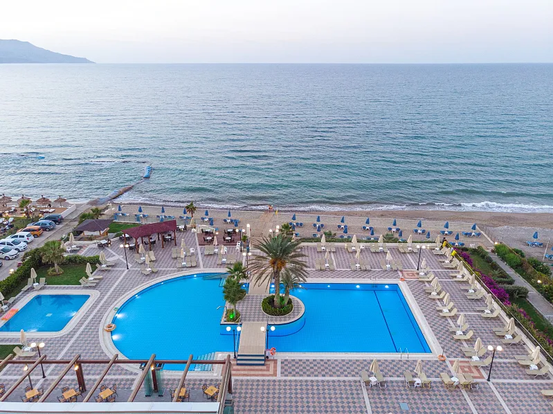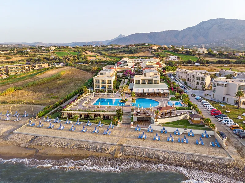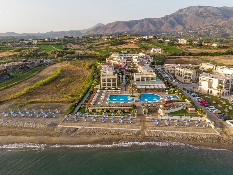 A 2004 built hotel complex on huge site, A’ category (4*), situated on the beach of Georgioupolis, between the traditional towns of RETHYMNO (15km) and CHANIA (40km), named after the ancient city of HYDRAMIA. In a friendly environment provides easy access to historical monuments, traditional villages and points of natural beauty of the western part of the island. (Samaria’s gorge, Kourna’s lake, Arkadi, Elafonissi, Argyroupoli’s springs, etc) The complex looks like a cosmopolitan village with pleasant walkways and gardens. The hotel offers excellent hospitality in pleasant surroundings and is good for any age group.