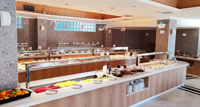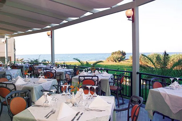 Restaurant. Set in pleasant surroundings with backdrop of the sea and illuminated fountain, it offers a great variety of different foods, Greek & international kitchen, thematic nights, BBQ. Breakfast: Full American buffet. Lunch/Dinner: Full buffet with cold & hot dishes