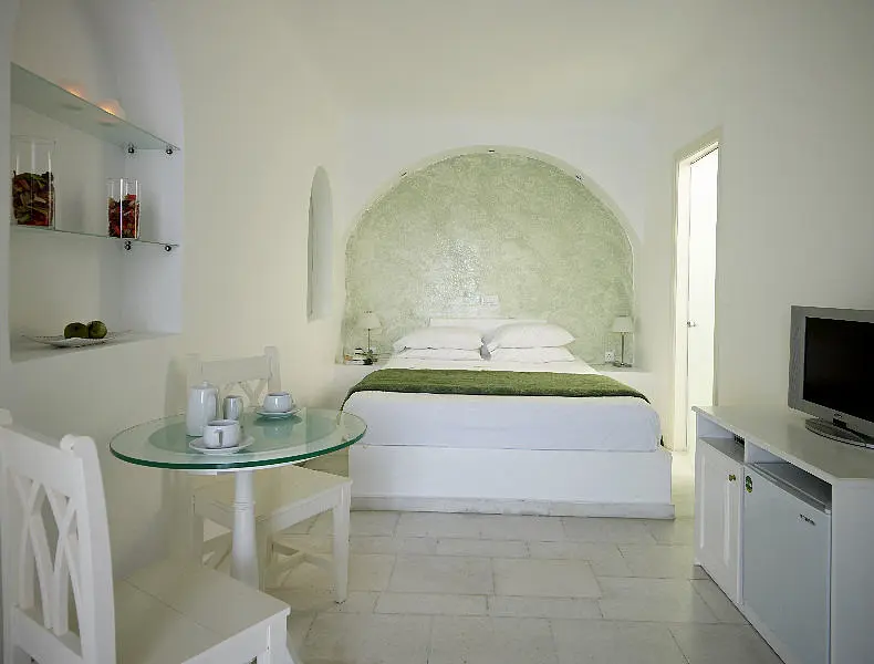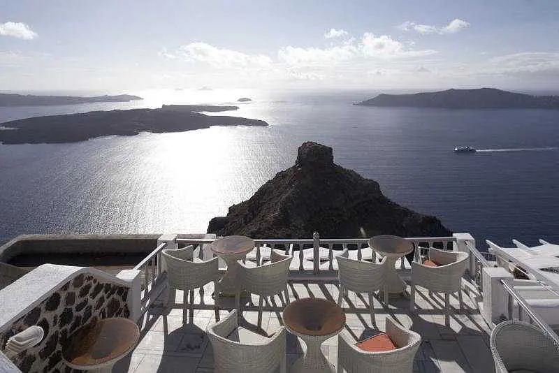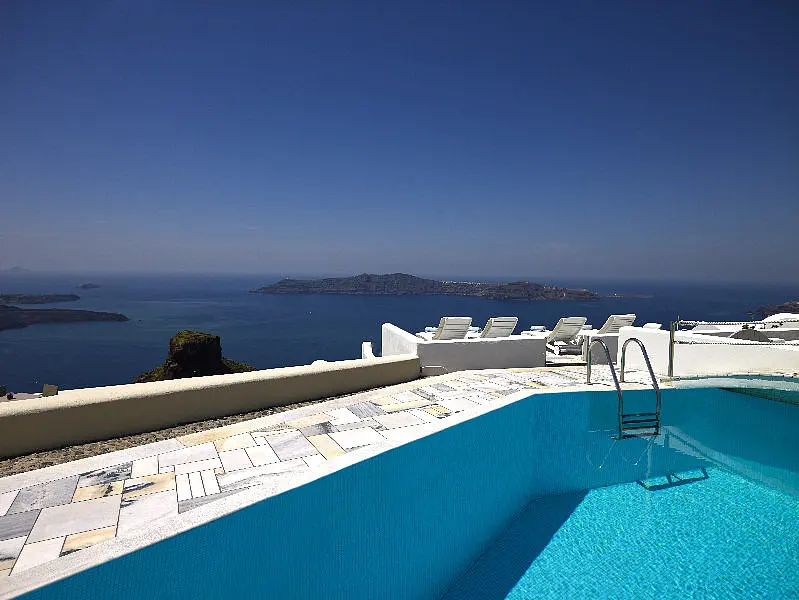 Built 350m above sea level it offers its guests the most fascinating view of the volcano and the little islands of the Aegean Sea, as well as of the dazzling sunset. It is set in Imerovigli - one of the most beautiful villages of Santorini island directly on the enchanting and world famous Caldera.|This apartment complex initially built in 1996, has been completely renovated and remodeled in 2010. Its features follow the traditional Cycladic architecture and blue & white colors and are now combined with stylish, modern & luxurious amenities and furnishings.