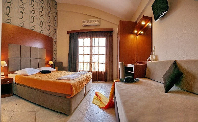 Situated within beautiful gardens in Skala Kallonis, the family-run hotel is just 400 metres from the beach. The towns restaurants and cafés are just a few minutes walk away.Guests can take diving lessons and earn PADI certification, or rent a bicycle, a motorbike or a car and explore the island.It is a 40-minute drive from Lesvos Airport.