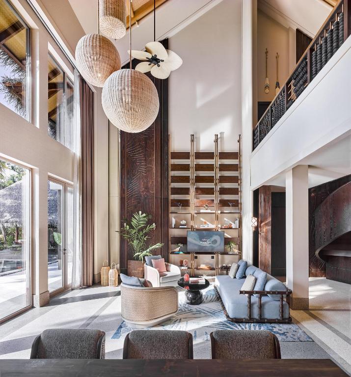 Restaurantul Saoke, proiectat de arhitectul japonez Noriyoshi Muramatsu, cu mobilier Kotatsu și un lounge elegant, serveste preparate din bucătăria Nikkei. Restaurantul italian, o părticică din Italia in mijlocul Insulelor Maldive, oferă de la paste italienesti autentice la nelipsitele aperitive Bellini și băuturi digestive Grappa. Barul Mura are foisoare și terase mari, cu vedere la plaja cu nisip alb și la apele sclipitoare ale mării.