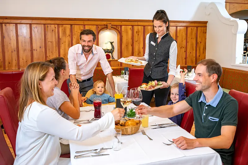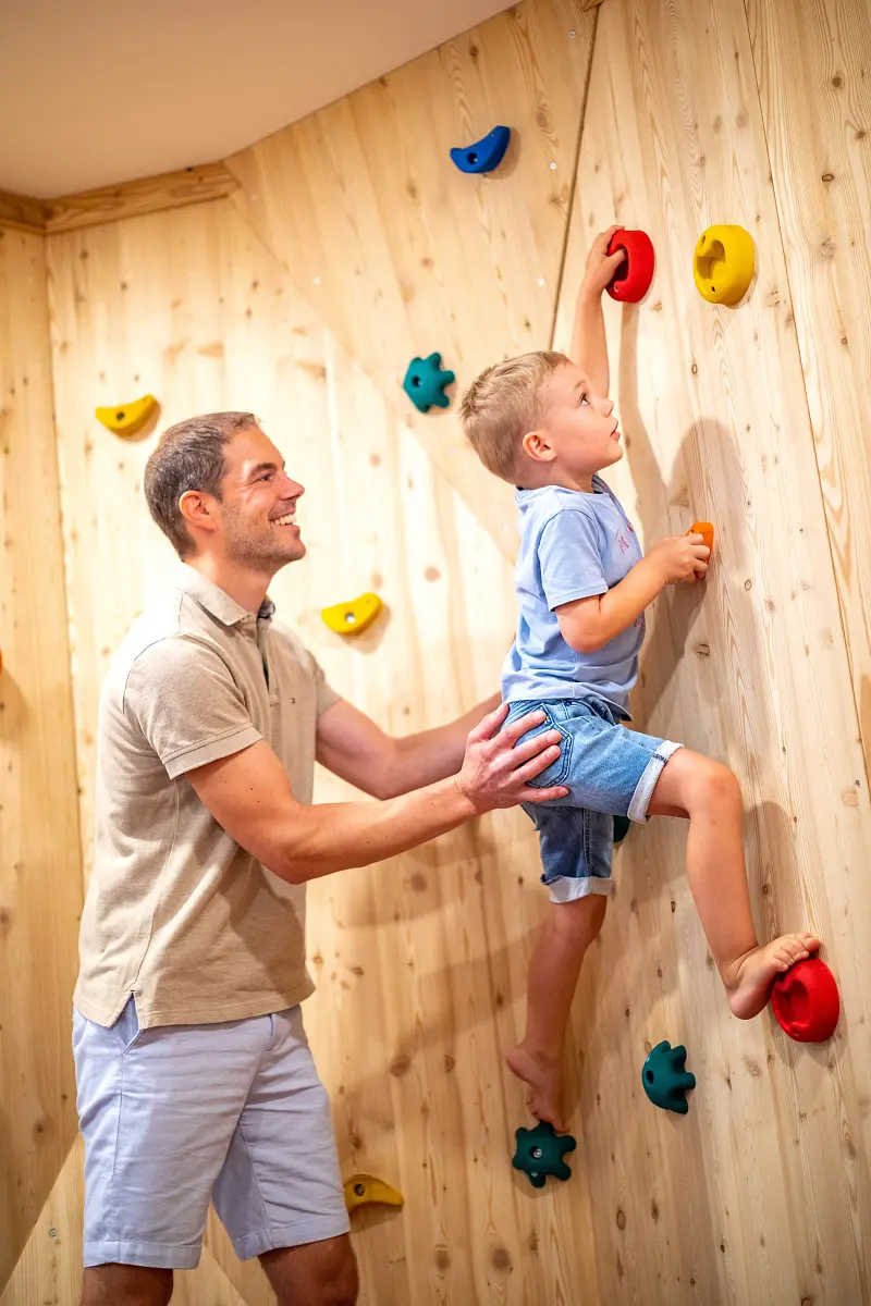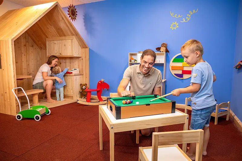Children love our 120 m² indoor play area with climbing tower, suspension bridge and climbing wall. Our 12 rustic-style pine rooms provide a cozy atmosphere, while 12 exclusive suites with tiled stoves offer special comfort.