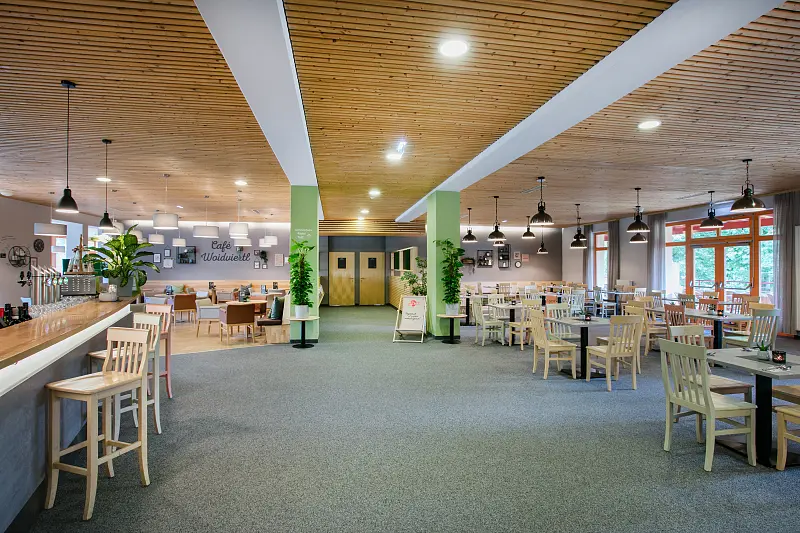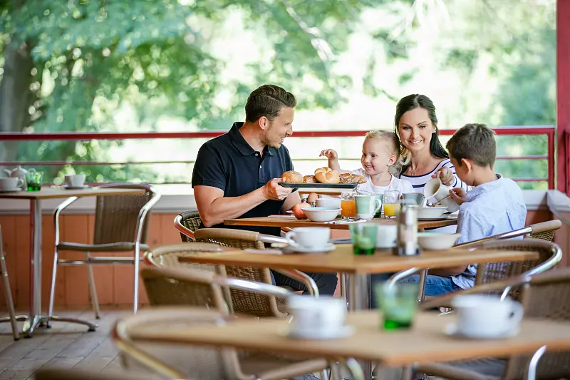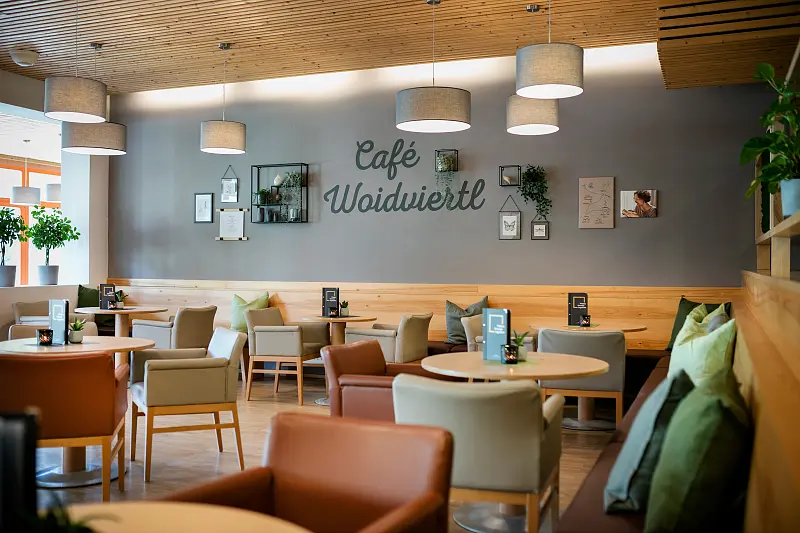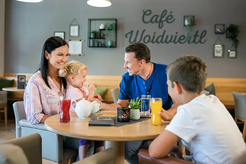 In the Café Woidviertl, our guests can comfortably enjoy regional delicacies. There are new wooden playhouses right in the café, which also keep the little ones entertained.