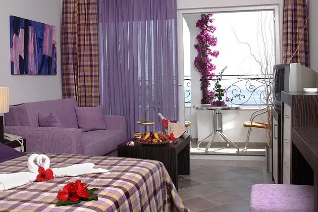 Camerele dispun de vedere spre mare sau gradina si sunt prevazute cu baie proprie, uscator de par, telefon, minibar, seif, balcon, TV, aer conditionat.