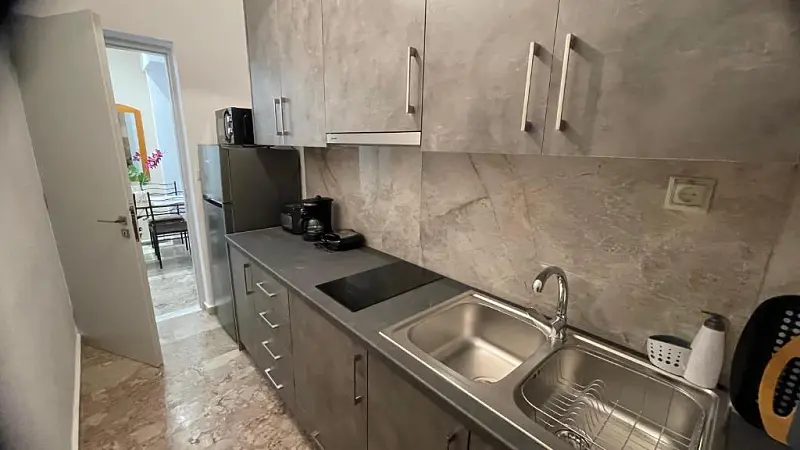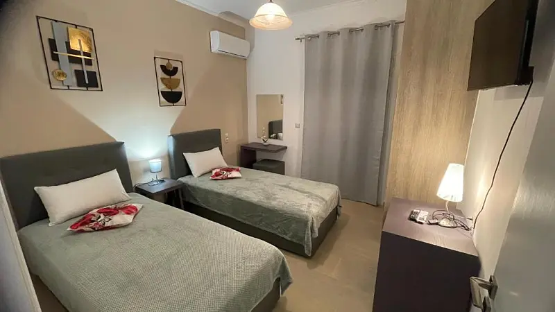 The apartments are located on the ground floor, with their own entrance and have 2 comfortable bedrooms, kitchen, dining room, bathroom with shower, two balconies and private parking. One bedroom has a large double bed and the other 2 single beds. Both bedrooms have TVs and air conditioning. In the kitchen you can prepare breakfast or meals. It has a ceramic touch hob with 2 burners, kettle, toaster, toaster and microwave. It is ideal for couples and families who want to enjoy their holidays in Nidri, but without being in the hustle and bustle of the center.