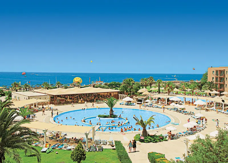 receptie, restaurant principal, 3 restaurante a la carte, 3 piscine in aer liber, o piscina ineterioara incalzita, piscina pentru copii, tobogane de apa, terasa, baruri, discoteca, sala de fitness, sauna, masaj, jacuzzi, baie truceasca, minigolf, aerobic, terenuri de tenis, minifotbal, basket, volei pe plaja, tenis de masa, internet prin cablu gratuit in zonele publice, internet cafe.