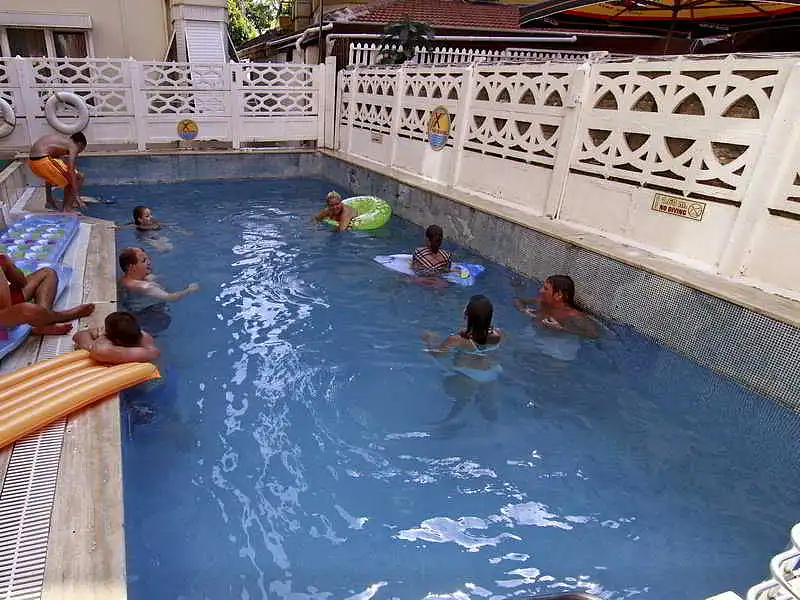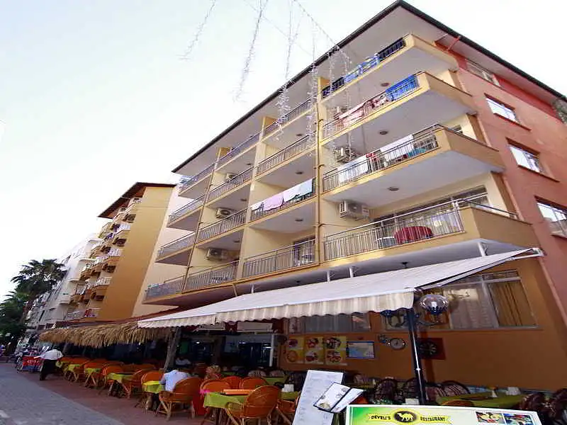 The hotel is located in the popular holiday region of Alanya, only 50 m away from the historical Kleopatra Beach and 130 km from Antalya Airport. It features 30 rooms, 24-hours reception, currency exchange desk, ticket service, lobby restaurant and bar, roof bar, TV room, pool and childrens pool, spa, hair dresser, medical service, tennis court, volleyball and high-speed internet. Wheelchair accessible.