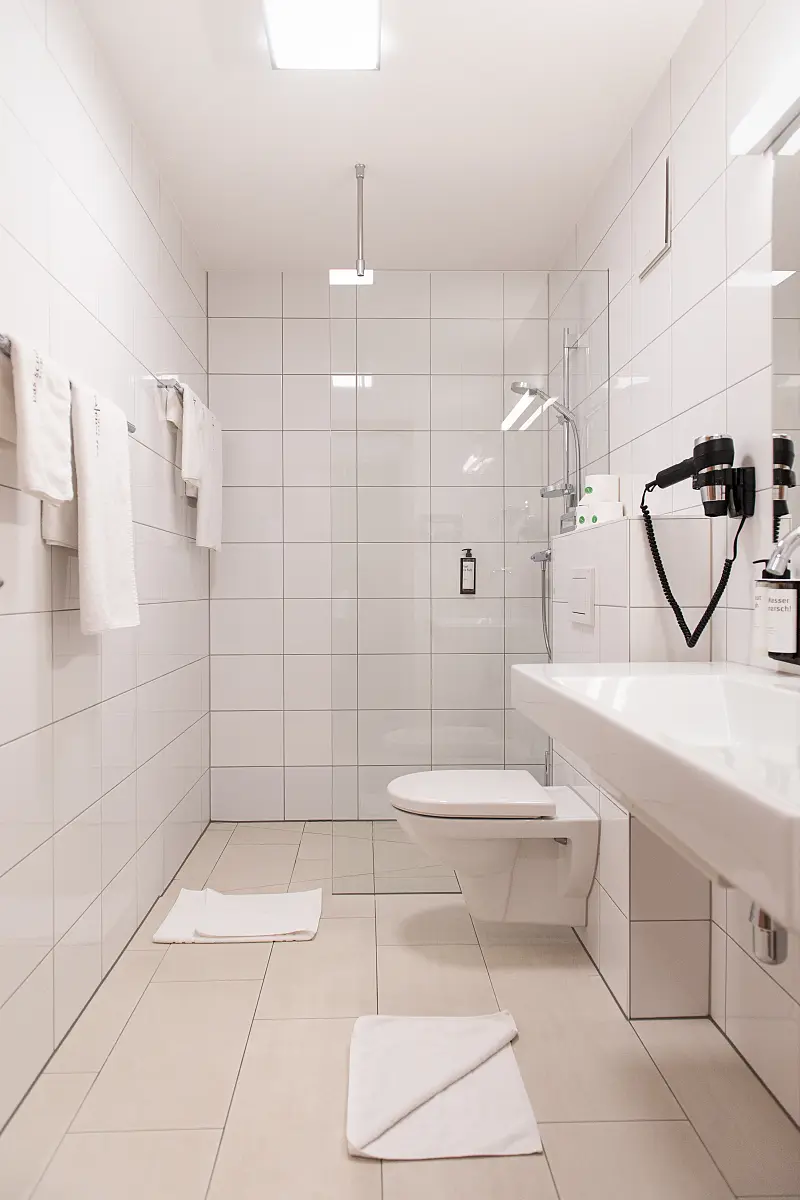 bath room: toilet, hair dryer, shower, bath robe - free of charge, bathing shoes - free of charge