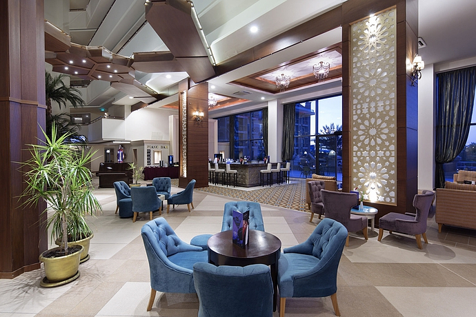 HOTEL: Este hotel construido en 2006, reformado en 2007, dispone de 466 habitaciones y 4 habitaciones adaptadas a personas con movilidad reducida. Hay disponible un vestíbulo con recepción, caja de seguridad, servicio de cambio de moneda, un ascensor, una cafetería, periódicos, kiosko y un pequeño supermercado. Además los clientes tienen a su disposición una peluquería, un bar, un club nocturno, un auditorio, una sala de juegos, salón para ver la televisión, un restaurante, instalaciones para conferencias e internet. Hay disponible servicio de habitaciones, servicio de lavandería y parking. Los mas pequeños pueden disfrutar de un miniclub y un patio de juegos para los mas pequeños. SITUACIÓN: Está situado en Titreyengol/Sorgun, está a unos 5 minutos del lago Titreyengöl. Está en una zona céntrica. A 1 km puede disfrutar de Titreyengöl, donde encontrará tiendas, bares, restaurantes y una parada de transporte público. Está a 70 kilómetros del aeropuerto de Antalya. HABITACIÓN: Las habitaciones cómodas cuentan con moqueta, balcón o terraza con vistas al jardín y al mar, baño con secador de pelo, teléfono de línea directa, aire acondicionado individual, calefacción individual, caja fuerte, teléfono, minibar, cama doble, un salón, televisión vía satélite y hilo músical. INSTALACIONES: Parte de las instalaciones del establecimiento son 4 piscinas, donde los clientes pueden disfrutar de una piscina interior con zona para los niños, un bar al aire libre, una terraza, tumbonas y sombrillas. Se realizan actividades como aerobic, gimnasia acuática, barco torpedo, esquí acuático, motos de agua, lancha motora, bucear, practicar surfing, windsurf, vela, catamarán, canoa, tenis, jugar al ping pong, un gimnasio, tiro con arco, montar a caballo, baloncesto, voleibol, volley playa, billar, petanca y bolos. Puede relajarse en un jacuzzi, una sauna, un solarium y un baño de vapor. Además los huéspedes podrán disfrutar de servicio de masajes y hidroterapia. Se ofrece un programa de entretenimiento. MÉTODOS DE PAGO: Se admite Mastercard y Visa.