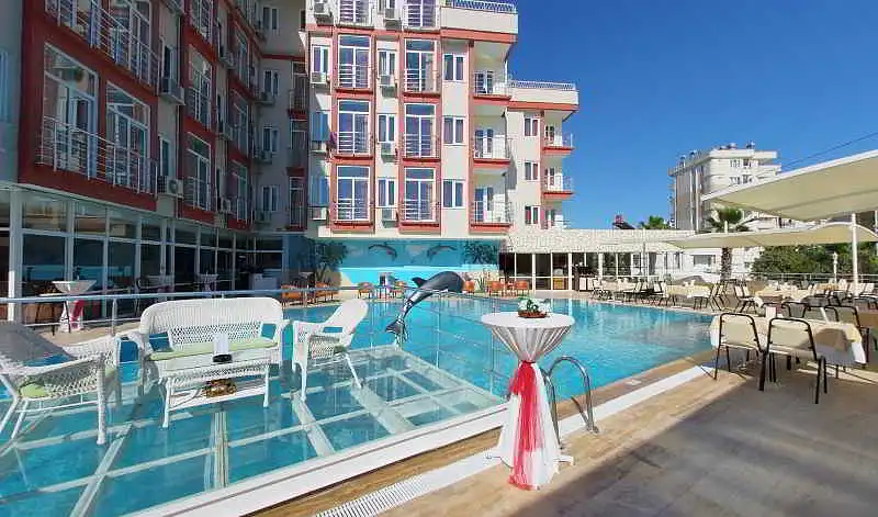 Located between the Kundu-Lara tourist area and Antalya city, this city hotel is suitable for business and leisure guests alike. The décor and furnishings are modern and attractive and features include an outdoor disco bar, large pool and spacious garden. The nearest beach is a 5 to 10 minute walk away and there are shops and restaurants close-by. Public transport runs at the end of the street with easy access to the city centre, 10 km from the hotel.