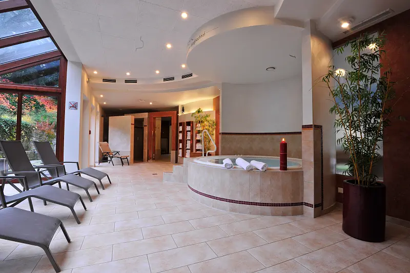 size wellness area 500 m², swimming pool area, outdoor swimming pool 15 m x 4 m, indoor swimming pool 12 m x 6 m, spa area: children not allowed, steam bath, sauna, finish sauna, sanarium, whirlpool - free of charge, relax room, nudity area, massage - on request, garden, lawn, deck chair - free of charge, sun umbrellas - free of charge