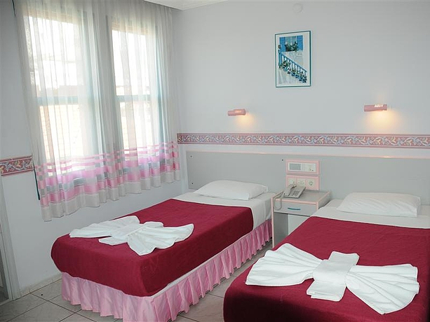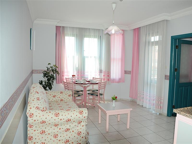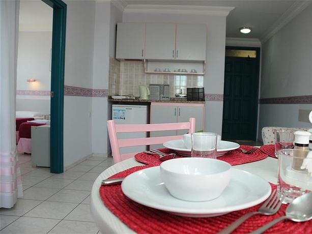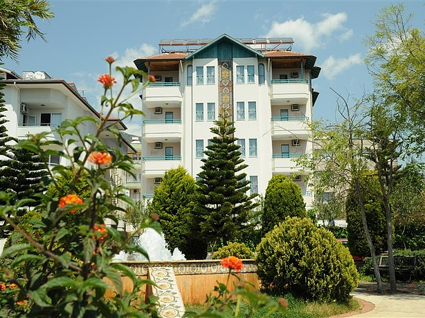 HOTEL: Este aparthotel cuenta con 38 habitaciones, 5 plantas, sistema de aire acondicionado, hall, una recepción, servicio de salida, cambio de divisa, ascensor, un bar, una sala de televisión, un salón para desayunos y servicio de habitaciones de pago directo. SITUACIÓN: Está situado a unos 15 minutos del centro de Atatürk. A 15 minutos los clientes encontrarán el castillo de Alanya. Este hotel, está a unos 10 minutos del centro histórico. Se sitúa a una distancia de 130 kilómetros del aeropuerto de Antalya. HABITACIÓN: Las habitaciones cuarto de baño, radio, una cocina pequeña, nevera, hornillos, cafetera, tetera, aire acondicionado individual y balcón o terraza. INSTALACIONES: Los clientes tienen a su disposición una piscina con una zona para niños, un bar al aire libre, tumbonas y sombrillas mediante un pago adicional. En la playa puede disfrutar de tumbonas y sombrillas con cargo adicional. COMIDAS: En lo referente a lo gastronómico se dispone de almuerzo y cena tipo menú.