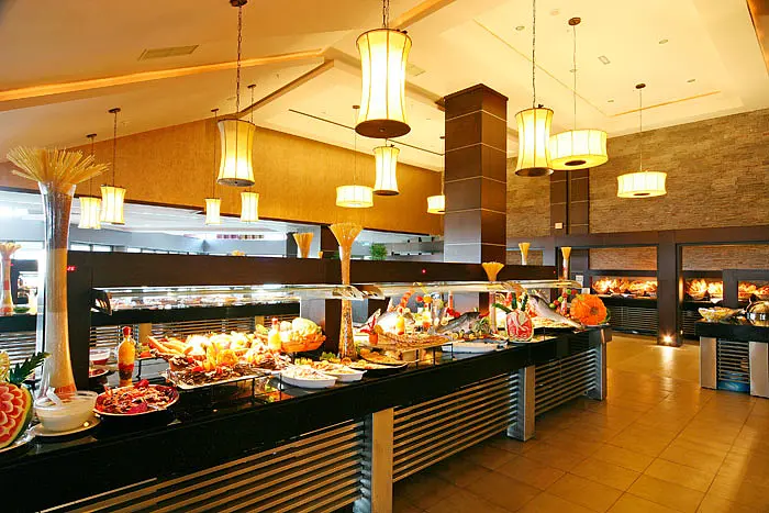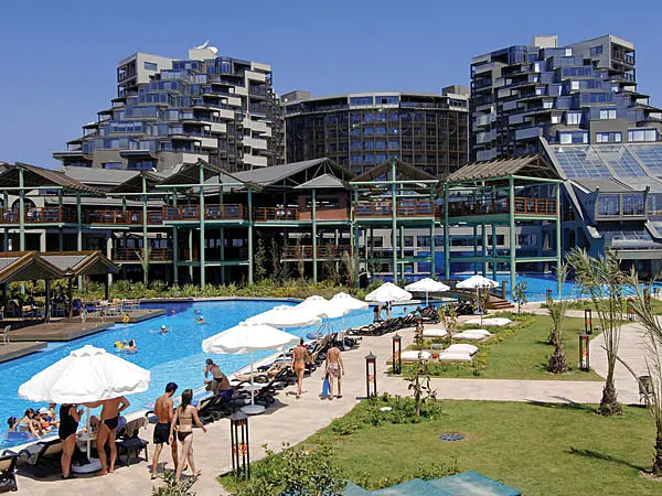 Restaurant principal, restaurant A la carte, piscina exterioara, piscina interioara, piscina pentru copii, topogane, bar, cabinet medical, spalatorie, internet, teren de tenis, baie turceasca, sauna, centru fitness, masaj, centru SPA. Hotelul are plaja cu nisip.