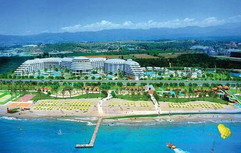 Built in 2006, this stylish hotel features large grounds and offers a total of 748 rooms. Facilities include a main restaurant and 5 à la carte restaurants with Asian, Turkish, Italian, Mexican and Mediterranean cuisine. In addition, there is a range of recreational facilities which include an 8-slide aqua park, pirate ship aqua park, funfair/lunapark and football field. Located across the road from a 600m long, sandy beach, the hotel is 4km from the tourist centre of Avsallar and 18km west of the popular resort of Alanya.