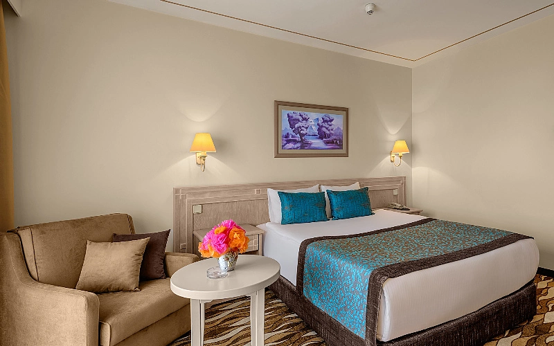 Surrounded by pine and orange trees in the coastal town of Goynuk and set between the turquoise sea and majestic Taurus Mountains, this hotel offers peace and quiet as well as an exotic oriental spa experience. The hotels modern, air-conditioned rooms feature en suite bathroom and a balcony with beautiful garden or sea views. The Thalasso Centre focuses on the healing power of the sea and features a variety of therapeutic rooms for guests to relax and rejuvenate, and guests of all ages can enjoy the three indoor and outdoor swimming pools. Those looking for adventure can find it in nearby Kemer, a popular resort town offering a wide range of water sports and activities including jet skiing, windsurfing, banana boating and diving, as well as a variety of shops, restaurants, and bars. With its combination of a tranquil setting and proximity to Kemer, this hotel is perfect for a relaxing beach holiday.