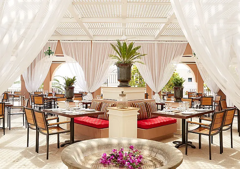 Hotelul ofera demipensiune (mic dejun si cina bufet), pensiune completa (mic dejun, pranz si cina bufet), pensiune completa Plus (mic dejun, pranz si cina, bauturi incluse la mese), sau ultra all inclusive (mic dejun bufet american 07:00-10:00 sau continental 10:00-10:30, pranz bufet 13:00-15:00, cina bufet tematic 19:00-21:30, bauturi alcoolice si non-alcoolice locale 10:00-01:00). Hotelul are un restaurant principal bufet, 4 restaurante A la Carte (italian, grecesc, international, american), un snack bar si 4 baruri.