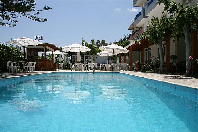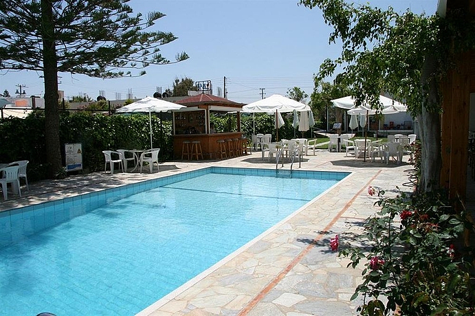 HOTEL: Este hotel con climatización, es ideal para familias y parejas y cuenta con 50 apartamentos y estudios. Los clientes disponen de hall, caja de seguridad, servicio de cambio de moneda y un restaurante. SITUACIÓN: Está situado en Ammoudara, a 100 metros puede encontrar la playa. Está a 4 kilómetros del centro de la ciudad de Heraclión. En las cercanías los clientes pueden encontrar bares, tiendas, restaurantes, cafeterías y mercados. HABITACIÓN: Puede encontrar apartamentos y estudios con aire acondicionado, cuarto de baño con ducha, televisión, teléfono, caja fuerte, nevera y balcón. INSTALACIONES: Los clientes tienen disponible una piscina con una parte para los niños y un bar.