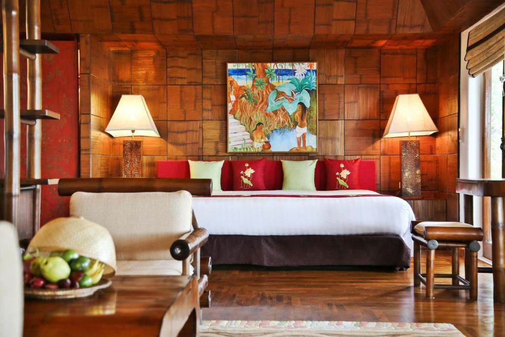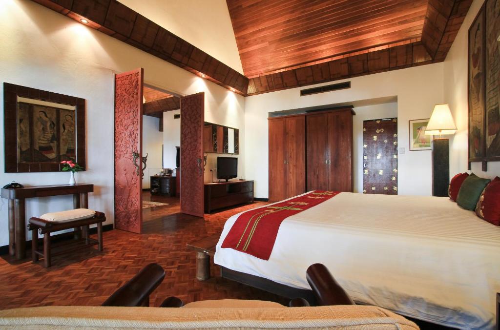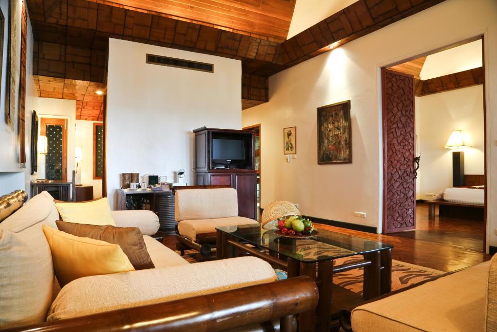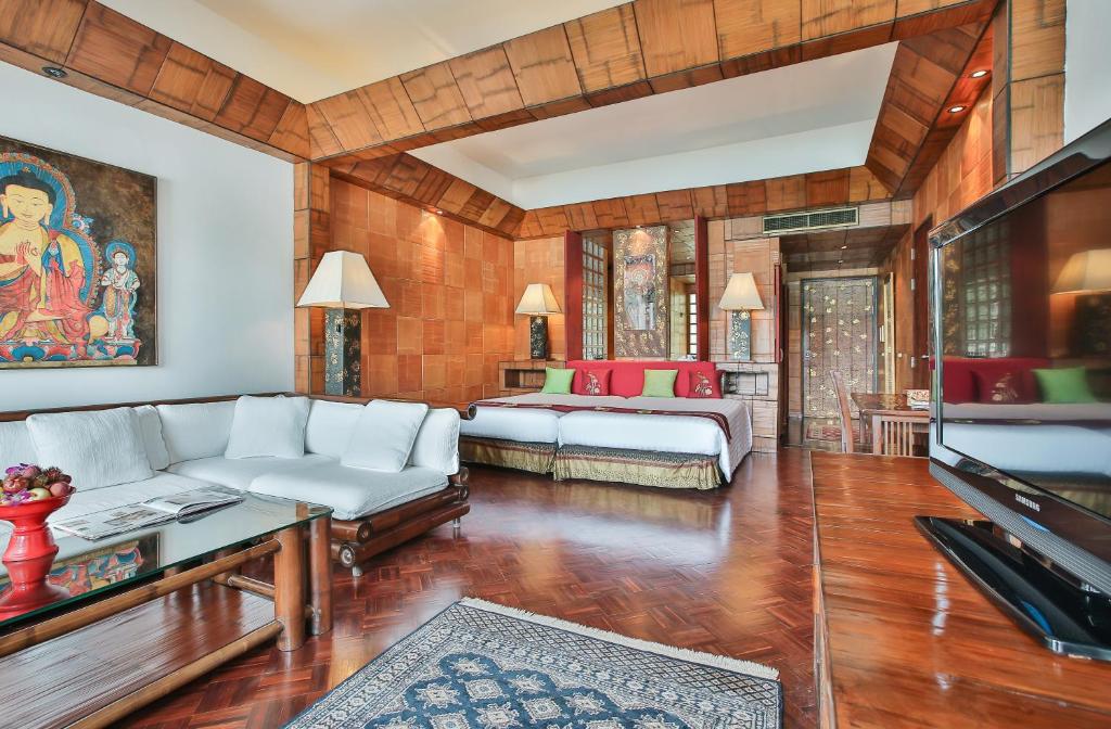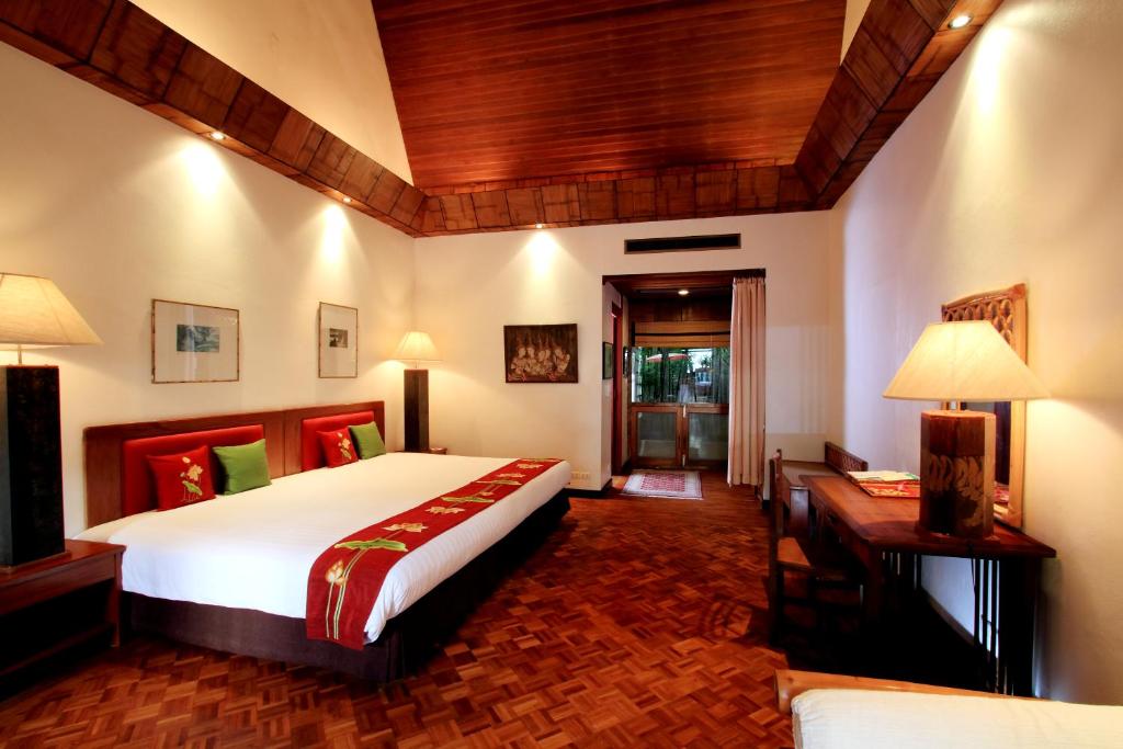 Suitele elegante de la Mom Tri’s Royale Villa au decor thailandez modern și podea din lemn. Fiecare vilă are balcon privat și zonă de relaxare cu TV cu ecran plat de 32 inch.
