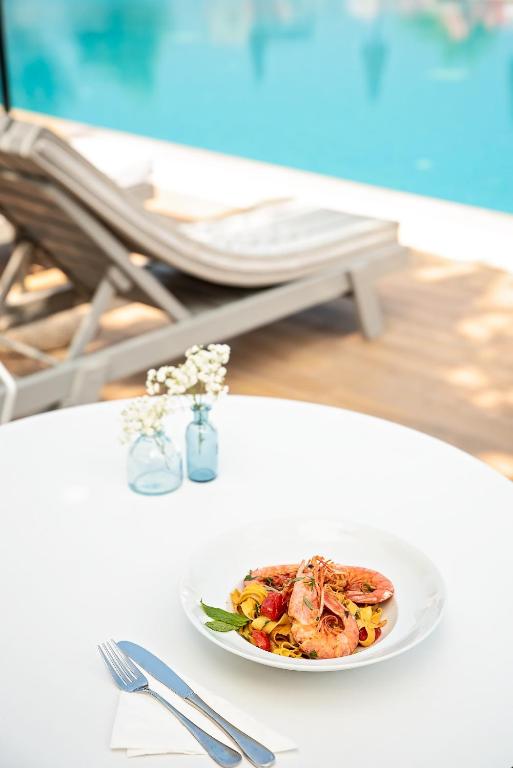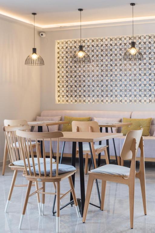 Zilnic este servit un mic dejun continental sau tip bufet. Oaspetii pot lua masa la restaurantul hotelului, care este specializat in bucătăria grecească.