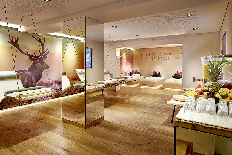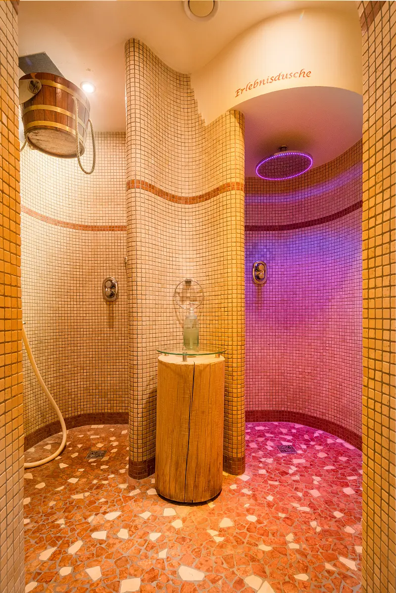 Our wellness oasis has a whirlpool, a country house sauna, a pine sweat room, a salt water steam bath, an infrared cabin with color light therapy, a solarium, an experience shower and a relaxation room.