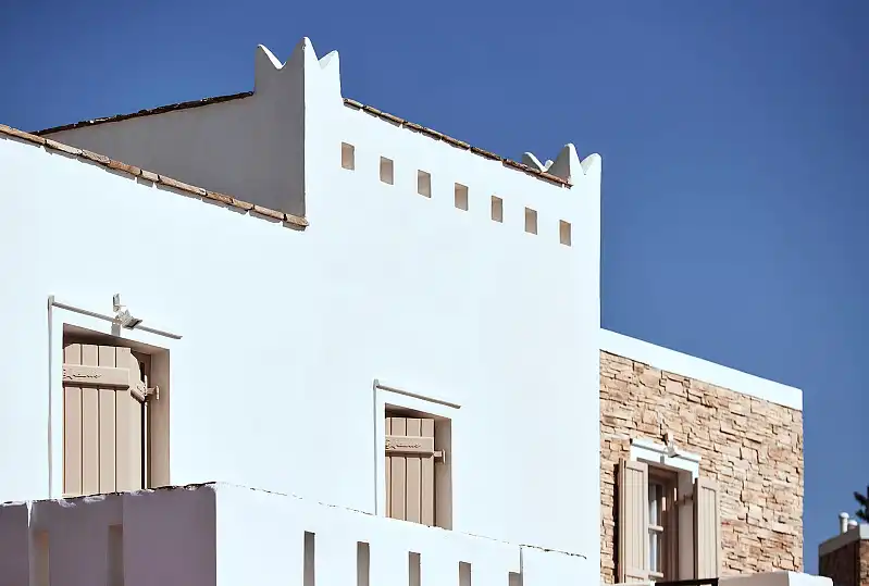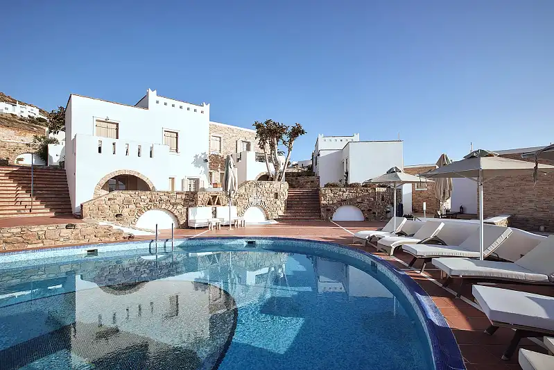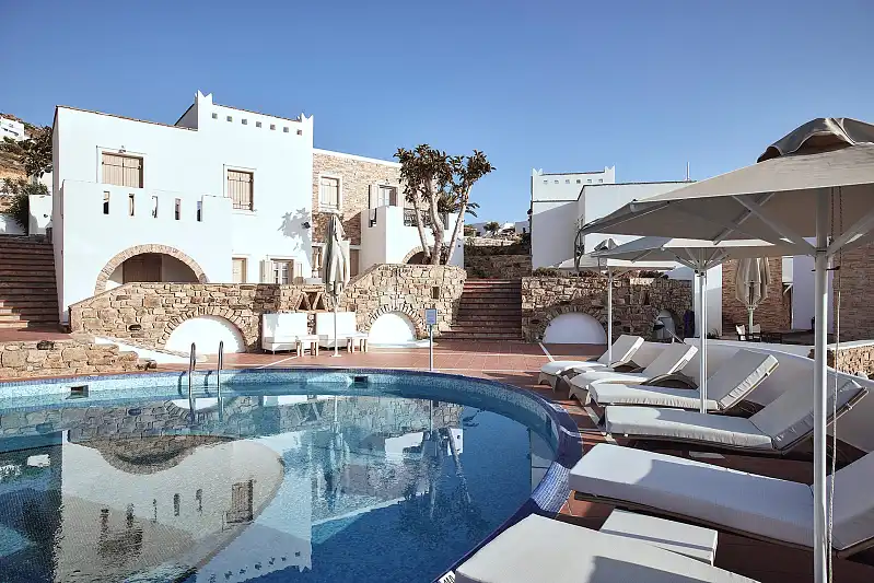 The elegant and spacious rooms feature classic island colors together with a low-key décor and minimalist Cycladic design. Meanwhile the colorful outdoor spaces and cool gardens together with the hotel's large swimming pool create the perfect environment for a stay on the island.