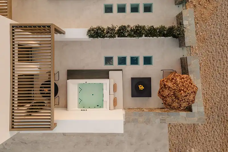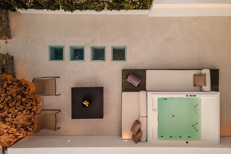 Entering the first floor, you will find a reception area, then two suites with private terraces with jacuzzi and all the amenities, then on the second floor you will find our other two suites with jacuzzi overlooking the Aegean and the temple of Apollo.