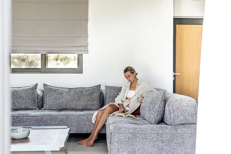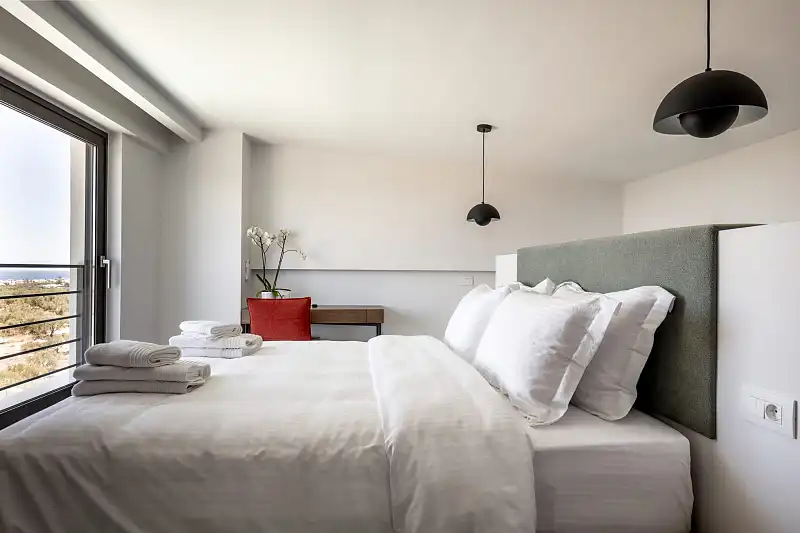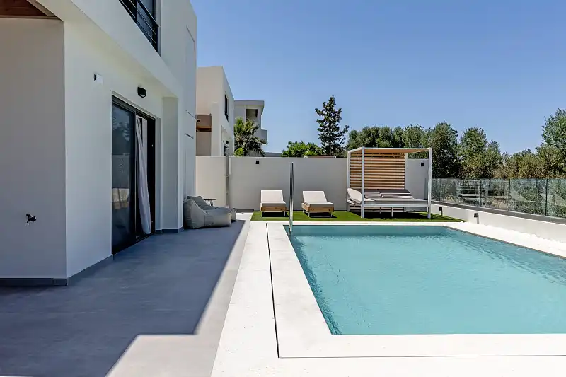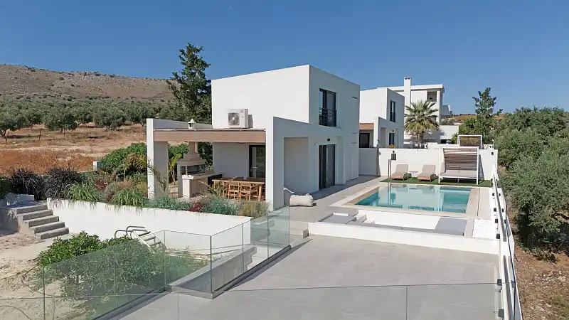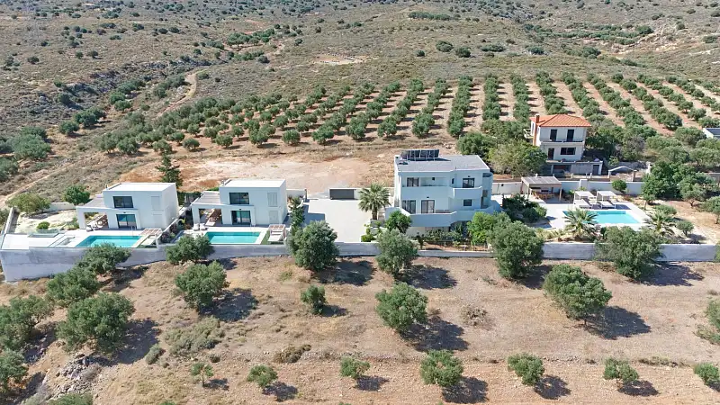 Welcome to NOLA - Nomadic Luxury Villas, a haven of modern elegance nestled amidst the serene olive groves on the outskirts of Gouves village in Crete. Our exclusive complex comprises three brand new luxury villas, providing an unparalleled setting for a tranquil holiday experience on this enchanting island. The centerpiece of our complex is the stunning three-bedroom villa, boasting mesmerizing sea views and a host of luxurious amenities. Step into your private oasis and discover a world of relaxation and indulgence. Lounge by the shimmering private pool, surrounded by lush gardens, sun loungers, and umbrellas, or dine al fresco under the pergola with a fully equipped barbecue area, perfect for savoring the Mediterranean flavors during the warm summer evenings. Upon entering the villa, you'll be greeted by a spacious living room adorned with comfortable sofas, a large TV, and a cozy fireplace. Adjacent to the living room, the dining area beckons with a generously sized table seating eight guests. The fully equipped marble counter kitchen is a culinary haven, complete with all the amenities needed to prepare delicious meals. A convenient bathroom and a laundry room equipped with a washer and tumble dryer ensure utmost convenience during your stay. Ascend to the top floor of the villa to find three luxurious bedrooms, each featuring a double king-size bed and a full bathroom. The master bedroom boasts an ensuite bathroom and a dedicated workspace, while each bedroom offers its own private balcony with panoramic sea views, perfect for enjoying the tranquility of the surroundings. In addition to the three-bedroom villa, our complex also features two identical two-bedroom villas, each with its own private garden, pool, and outdoor dining area. These villas offer a cozy retreat for smaller groups, with fully equipped kitchens, comfortable living spaces, and private bedrooms with ensuite bathrooms. We are looking forward to welcoming you to our oasis in Crete!