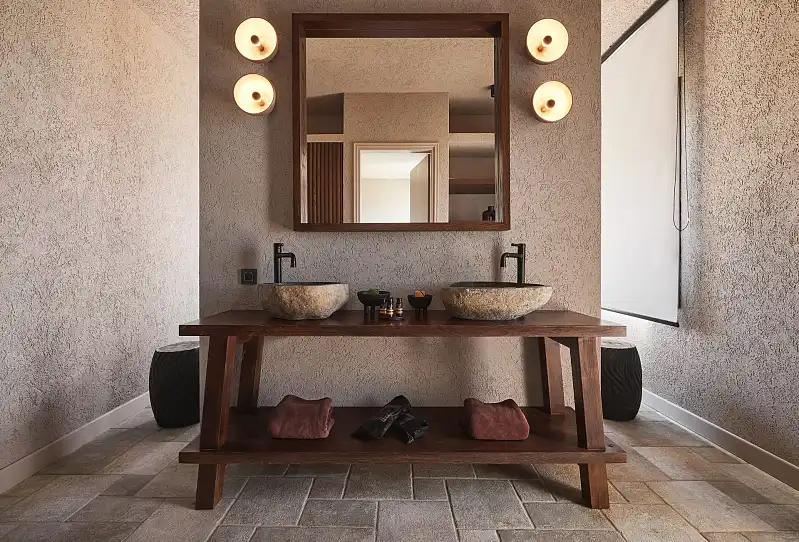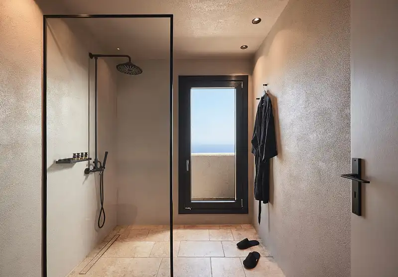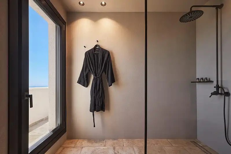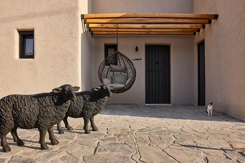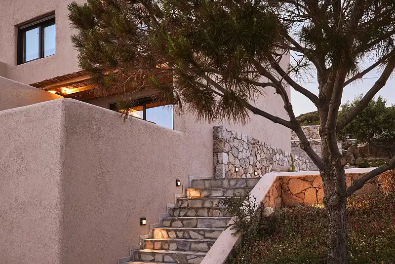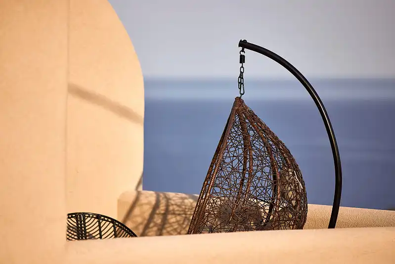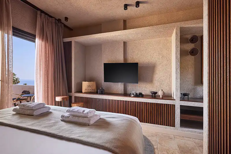 Created far from the ordinary island style, Noma expresses a neutral softness, covered by the beauty of nature. Lofty ceilings and tall windows reveal strong vertical lines and multiply the warm sense of coziness. Wood furnishings and clay pieces are smoothly adjusted to the relaxing earthy shades of the rooms, creating a soothing mood. A beautiful blend of stone and rocky materials combined with straw and rope decorations matches with the surrounding world of nature and elevates these spacious warm rooms. The majestic views of the Aegean blue introduce you to a visual and emotional harmony, against the backdrop of this tranquil hideaway called Noma.