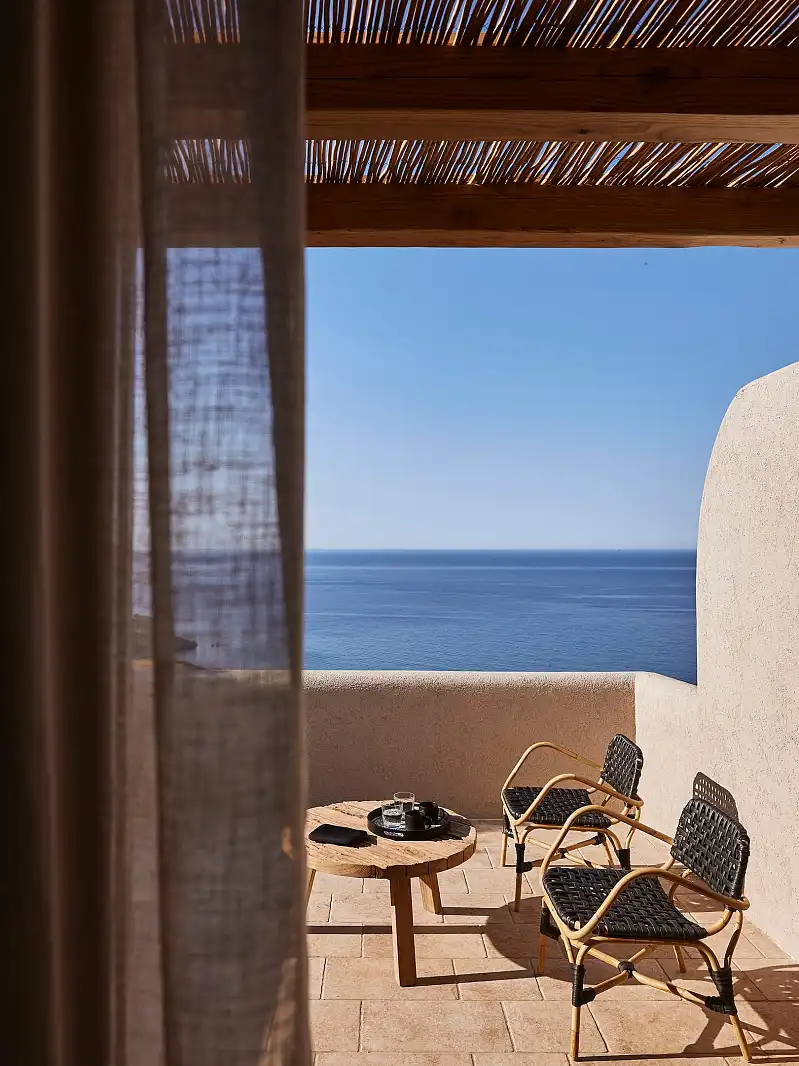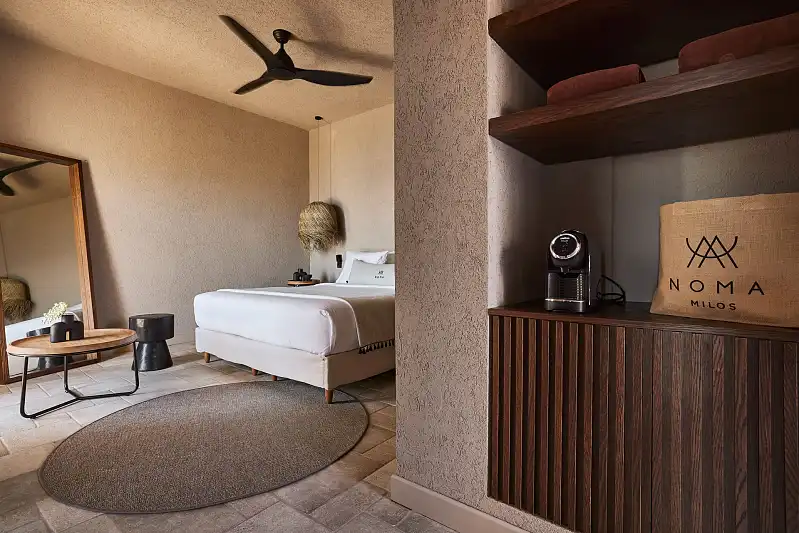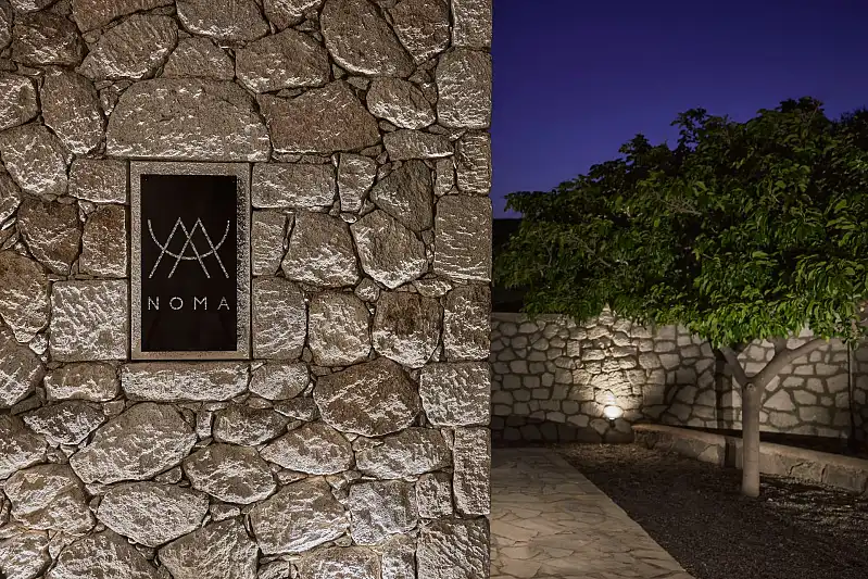 Composed with the gentle colors of nature, Noma is revealed in the scenic region of Kipos in Milos. Settled on a sloping landscape with captivating views of the Aegean waves and the mountainous backdrop, the inspirational rooms of Noma offer the vital pleasure of privacy.