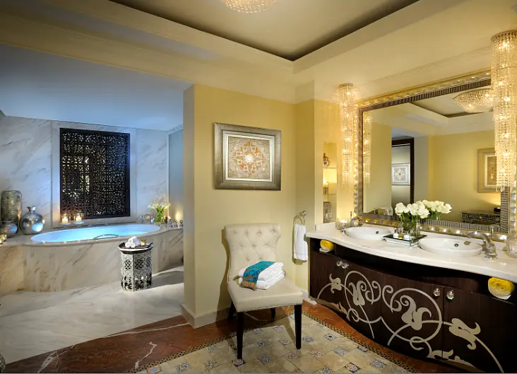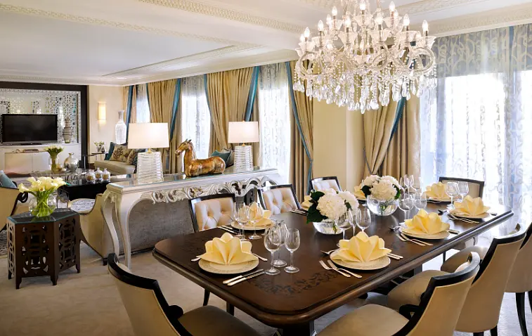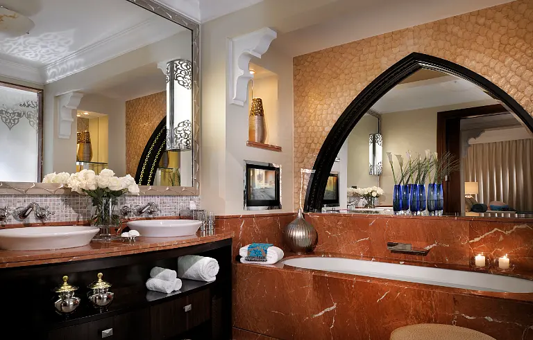 The hotel One & Only Royal Mirage is located in the vicinity of a private beach. There is a shuttle service between the hotel and the airport. The beach is patrolled by a lifeguard. Here, there are sun loungers, sun umbrellas and beach towels available. Cold drinks are served at the beach bar. To reach the beach a shuttle is provided. The air-conditioned hotel is equipped with a 24h reception (check-in is possible around the clock), a lobby bar, Wi-Fi, internet access, a lift, a shop, a boutique, cash machine, a hairdresser, a jacuzzi, showers and changing rooms, a first aid kit, parking spaces as well as a TV lounge. In the outdoor area of the property you will find a garden as well as a seasonally heated pool (open all year), where sun loungers and pool towels are available for free. For children there is also a separate children's pool. Furthermore, you can relax outdoors on the sun terrace. Inside the hotel you can use an indoor pool. You can store your valuables in the safe, and your luggage in the hotel`s storage room. For your entertainment, the hotel offers a library/reading room and a disco. For very young guests, kid`s chairs can be provided. For the smallest children prams can be rented in the hotel. There is also a laundry and ironing service. For your comfort, in addition to the concierge service the hotel page will ensure you are looked after. If necessary, you can contact the medical centre at any time. Guests at the accommodation can get a wake-up call from the hotel personnel. For conventions and other business meetings, the hotel offers a business centre as well as a conference area with scanner, overhead projector as well as a catering service. If you want to explore the holiday region, you can use the car and motorbike rental service close to the hotel (extra fee). In addition, the hotel sells tickets for excursions. For guests on their honeymoon, the hotel has special offers such as special honeymoon packages. In your hotel, a lot of focus is placed on sustainability. This includes among others a central room air-conditioning. The hotel requires that all guests pay a deposit upon arrival. Due to its barrier-free facilities , such as wheelchair accessible rooms, the hotel is also suitable for wheelchair users. Catering As catering services the hotel offers half board and full board. Breakfast is offered American, continental, from the buffet, à la carte or as brunch. Enjoy your lunch from the buffet or as a set meal. Dinner is also served as a buffet, as a set meal or à la carte. For the meals, there are a buffet restaurant with terrace (Mediterranean, calorie-reduced, gluten-free and vegetarian dishes) and a 24h snackbar as well as the pool bar. A picnic bench can be used by guests for self-catering. Appropriate clothing is required for lunch and dinner. Sports & Leisure To keep your fitness up on holiday, there is a gym (open 24 hours a day) for guests to use. Spinning bikes are also available. The golf course offers a putting green. In and around the hotel, you can take advantage of various water sports, including banana and speedboats, wake boarding and water aerobics. In addition, there is an all-purpose sports field in the surroundings of the hotel. If you don`t want to miss out on training with a ball during your holidays, you`ll find a grass football pitch and an indoor basketball court. During your holiday you can also take part in aerobics and yoga courses. There is also the option to play billiards or badminton. With beach volleyball, darts and volleyball various other sports offer a lot of variety on holiday. In addition to a tennis court (indoor/sand/hard court/carpet) with floodlighting there is also a tennis school and a tennis rental. For cyclists there is a bicycle rental as well as a bicycle workshop. Cycling maps can also be purchased in the hotel. Furthermore, various water sports such as kayaking, windsurfing and snorkelling are offered in the area. For snorkelers equipment is provided at a diving rental shop. A sauna awaits you for relaxation. The hotel also offers massages, beauty treatments and physiotherapies. Spend some healthy and relaxing hours with heat therapy. Children can be looked after in the hotel`s own miniclub. For child care there is a babysitter service in your place of accommodation. Junior hotel guests can let off steam in the mini disco. Furthermore there is a youth club. In terms of adult entertainment, evening shows and live music are presented and there is a games room available to use. Additional information This hotel is gay-friendly.