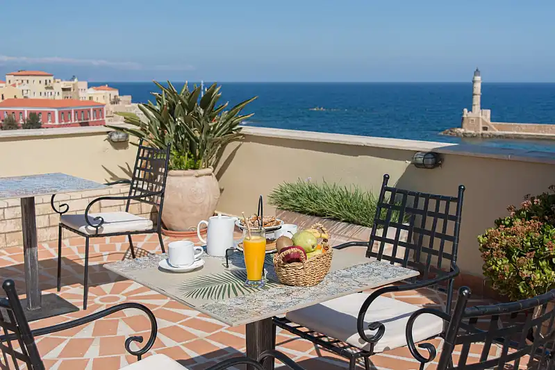 Hotel Pandora Suites comprises of spacious, comfortable and fully equipped rooms. It has 3 Suites which can easily accommodate up to 4 persons and 8 Double rooms. Most of them have their own balcony, some with view to the old port, while others are viewing at the neighboring streets. At the hotel’s top floor is the roof garden where guests can enjoy their breakfast or a drink with the best view in Chania Town.