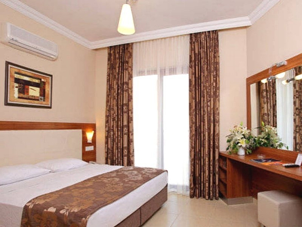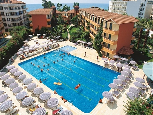 HOTEL: Este hotel contemporáneo, cuenta con 240 habitaciones y 380 camas. Los clientes disponen de un vestíbulo con servicio de salida express, una recepción, cambio de divisa, ascensor y salón de peluquería. También cuenta con un salón de televisión, un patio de juegos para los mas pequeños, una cafetería, un bar y un restaurante. Se ofrece instalaciones para conferencias y parking. Bajo cargo encontrará servicio de lavandería y alquiler de bicicletas. SITUACIÓN: Está situado en la playa. Este hotel, está en el centro de la ciudad de Alanya. A 400 metros puede encontrar el centro histórico. También puede encontrar las zonas comerciales y lugares de ocio. A 125 kilómetros tiene disponible el aeropuerto de Antalya. HABITACIÓN: Las habitaciones cuarto de baño, secador de pelo, canales de música, aseo, bañera o ducha, caja fuerte, aire acondicionado individual y calefacción individual. Además tienen televisión vía satélite, teléfono de línea directa, minibar y balcón o terraza. INSTALACIONES: Los clientes tienen disponible una piscina con una zona para niños, un bar de snacks, una terraza con tumbonas y sombrillas. Además cuenta con un centro de deportes, tenis mediante un pago adicional, squash, ping pong, voleibol y billar mediante un pago adicional. Se ofrece a los huéspedes deportes acuáticos, bailes y una sauna con cargo adicional. En la playa puede encontrar tumbonas y sombrillas. MÉTODOS DE PAGO: Se admite American Express, Mastercard y Visa. OTRAS: Con referencia a lo gastronómico puede disfrutar de desayuno dispuesto en forma de buffet.
