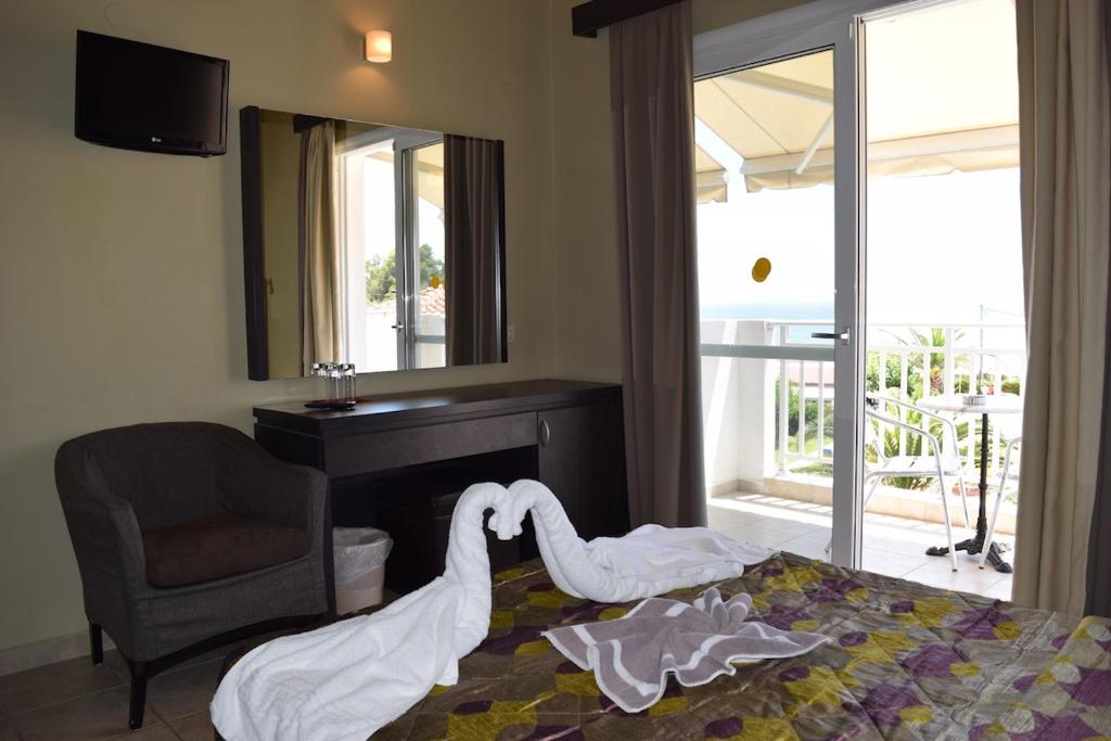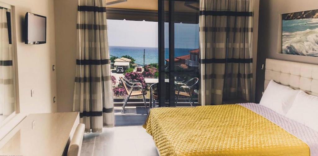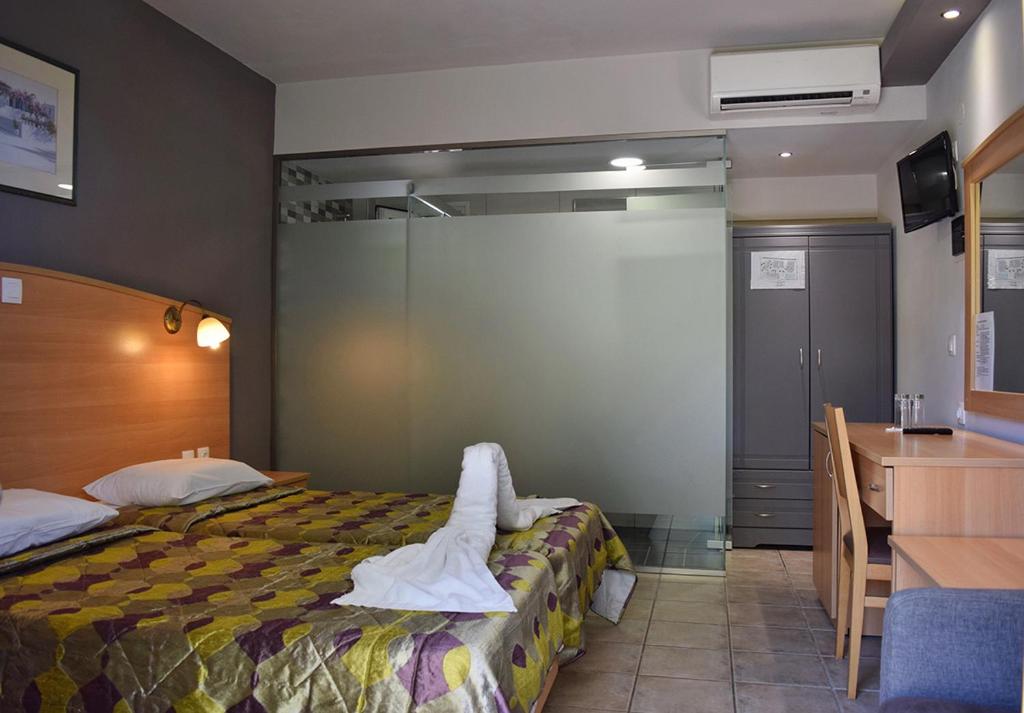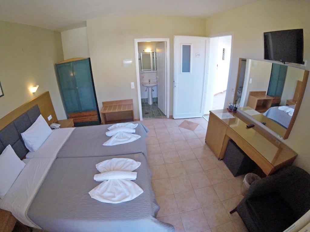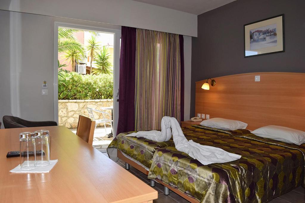 Cu vedere la Marea Ionică de la balcon, camerele hotelului Paspalis sunt dotate cu aer conditionat, seif, frigider si TV cu canale prin satelit. Fiecare include o baie privată cu dus si uscător de păr.