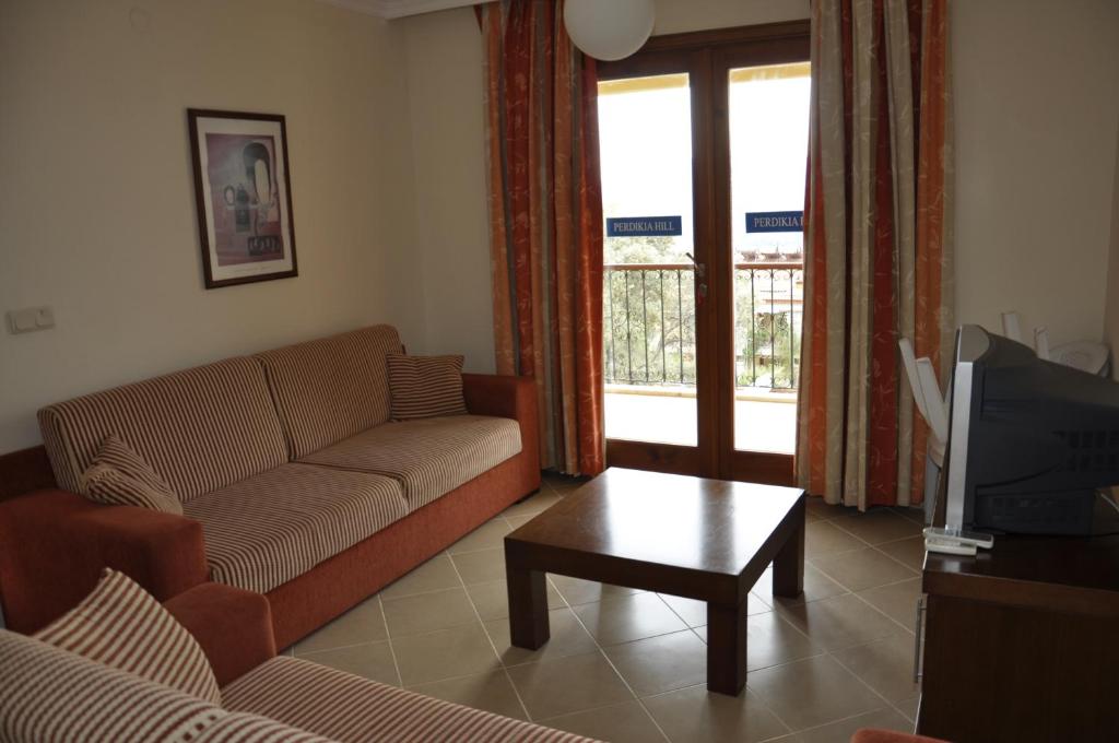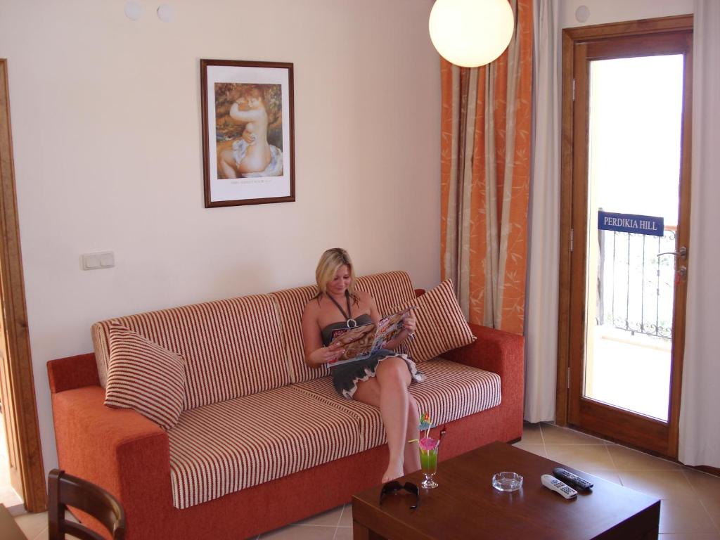 Camerele cu aer conditionat de la Perkidia Hill sunt decorate in nuanțe calde si au mobilier din lemn. Toate au minibar, uscător de păr si baie privată.