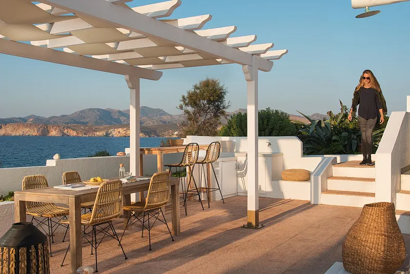 Settled near the beach of the picturesque fishing settlement of Pollonia, in the north-eastern part of Milos island, Perla Suites is a tranquil seaside apartment complex enjoying unobstructed views of the Aegean Sea, Milos’ landscapes, as well as Kimolos and Sifnos islands. The hotel boasts a modern Cycladic design, offering cozy rooms and a furnished patio as a shared lounge space with magnificent views.